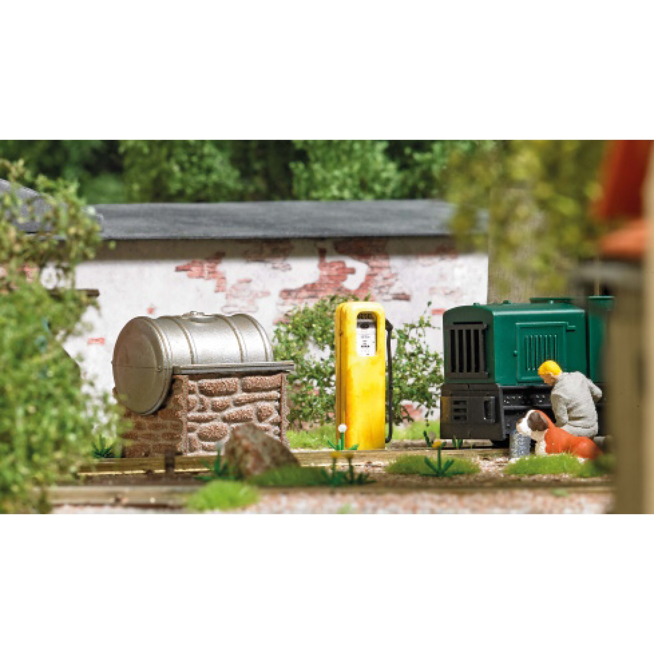 Diesel-Tankstelle, kleine Dieseltankstelle für Feldbahnen, mit Zapfsäule und Tank mit Steinsockel, Bausatz, 20 x 17 mm, Höhe 21 mm