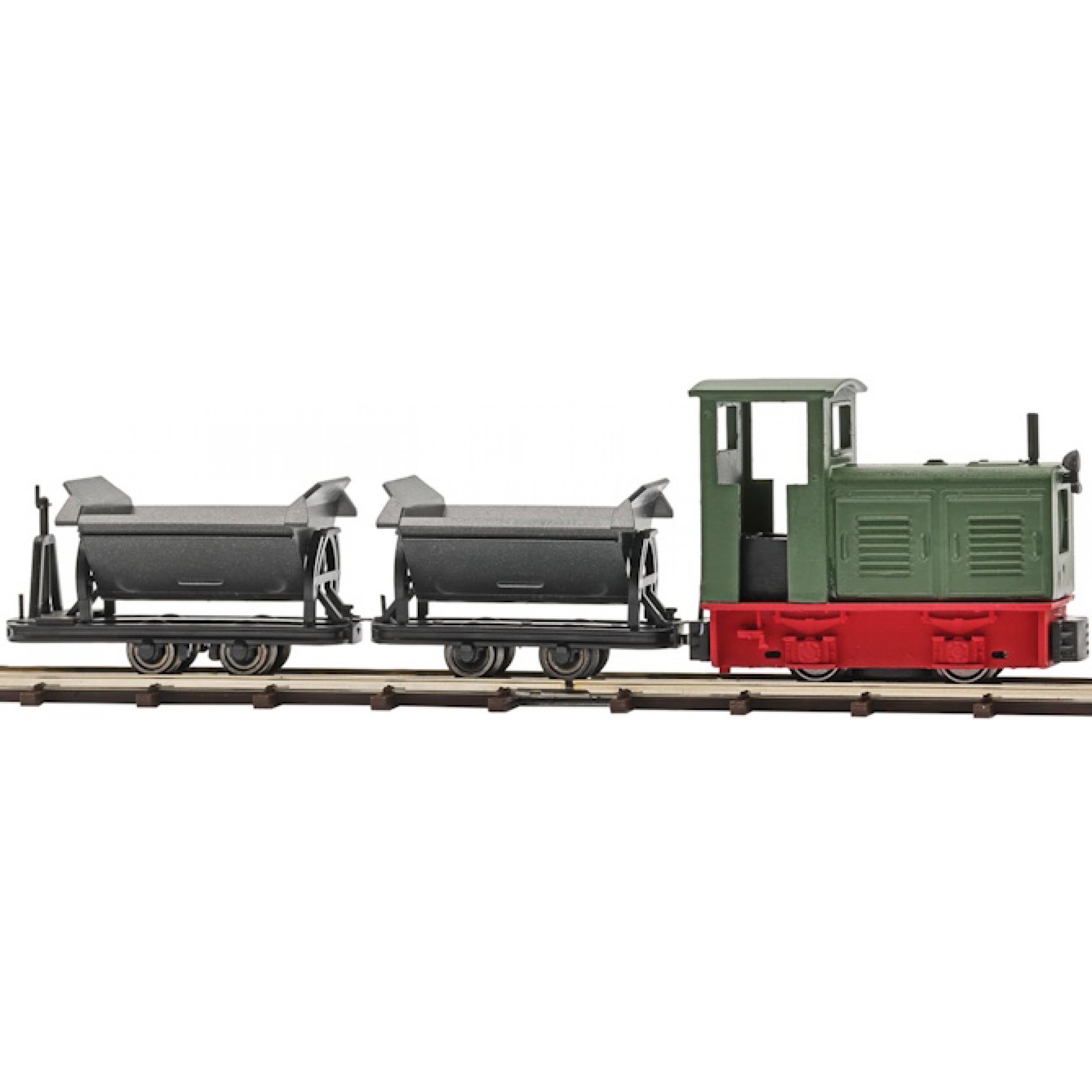3. Feldbahn Start-Set Ns2, Feldbahn Diesslok mit 2 Muldenkpppwagen O&K, mit Gleisen, Batteriekasten, Schalter usw.