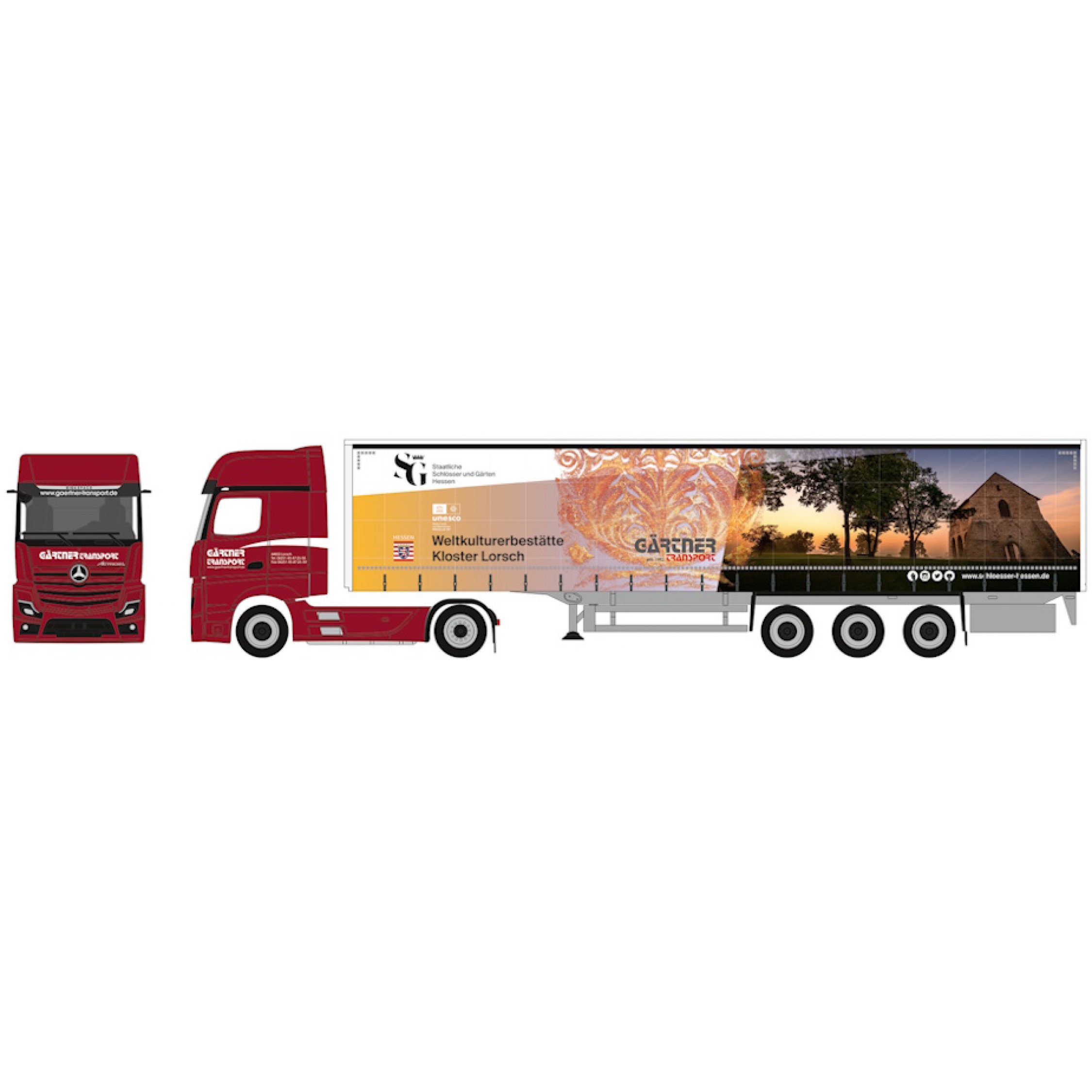 Mercedes-Benz Actros 18 L Gigaspace Gardinenplanen-Sattelzug, Gärtner Transport GmbH Spedition + Logistik, Weltkulturerbestätte Kloster Lorsch, Hessen