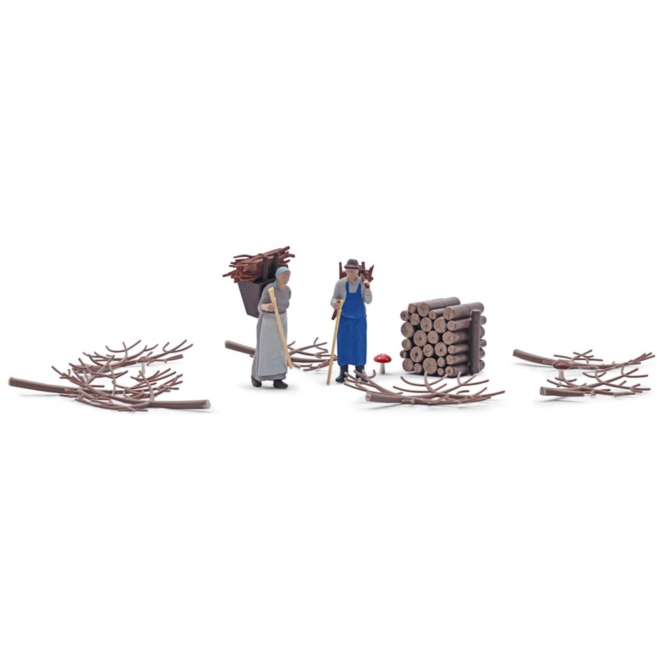 Reisig sammeln, ein Mann und eine Frau sammeln Reisig, Holztapel, Fliegenpilz usw.