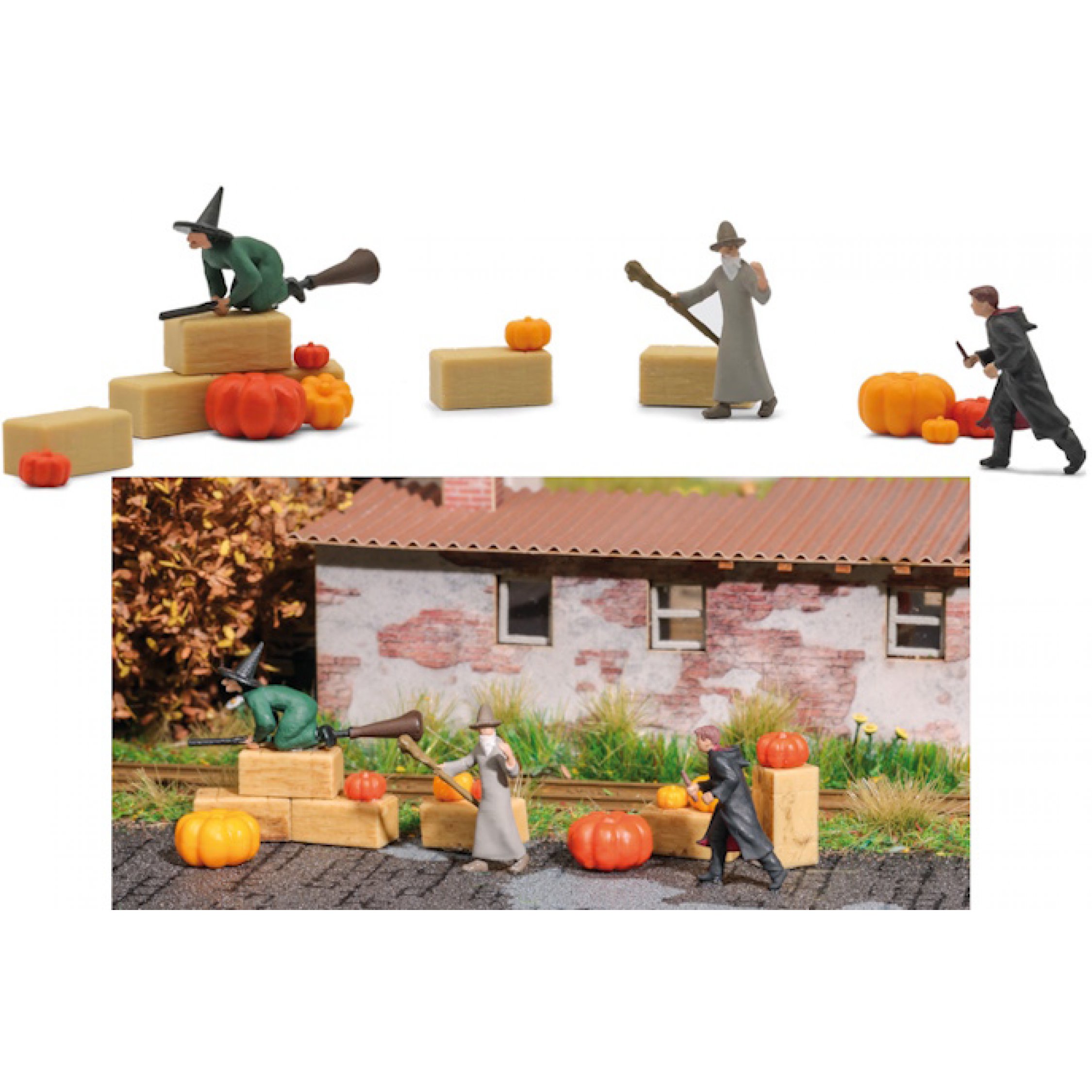 Süßes oder Saures? - Halloween 2 verkleidete Kinder, Hexe auf fliegendem Besen, Figuren fertig bemalt, Heuballen, bunte Kürbisse