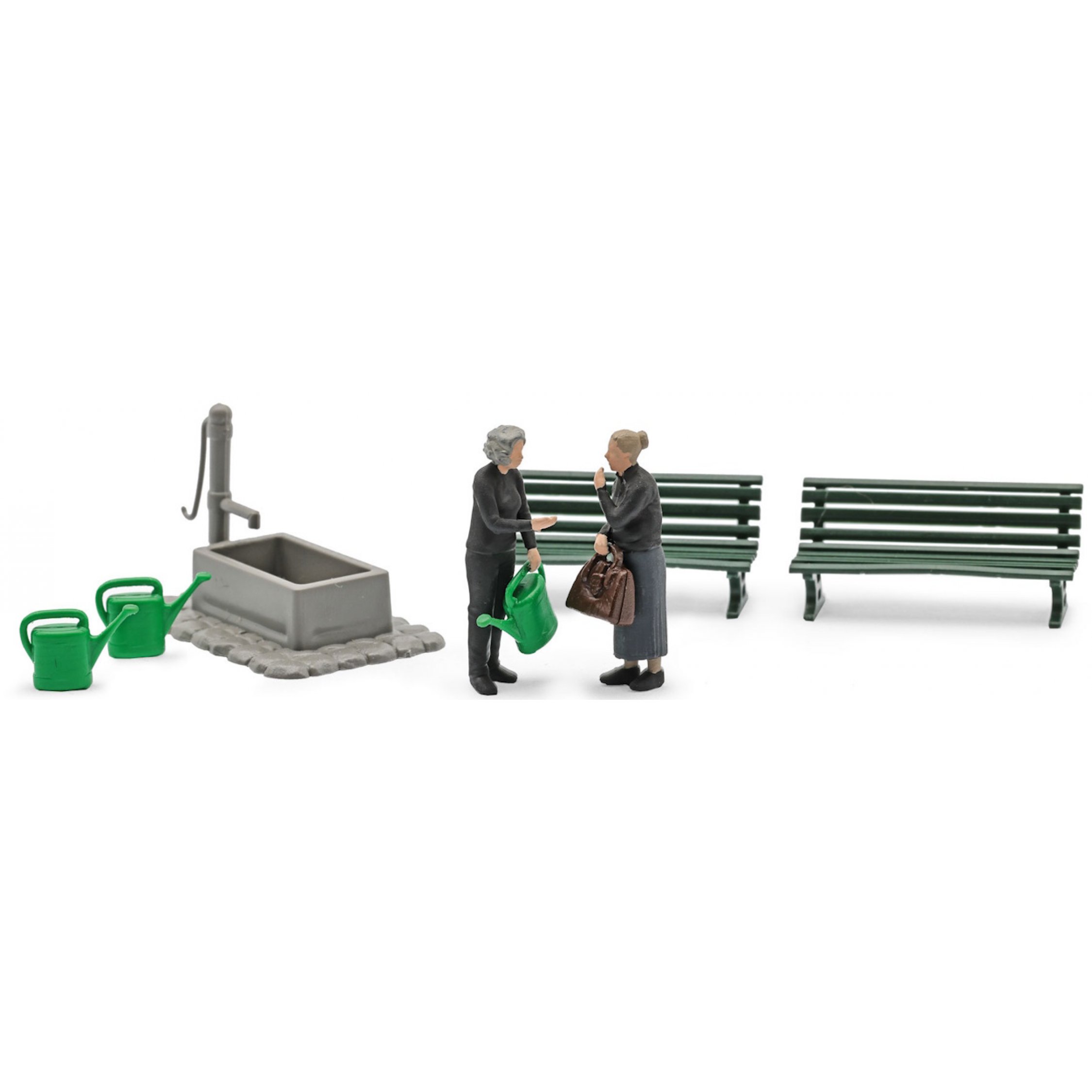 Witwentreffen, 2 ins Gespräch vertiefte Damen mit Gießkanne bzw. Handtasche, 2 Parkbänke, Brunnen mit Schengelpumpe, 2 weitere Gießkannen