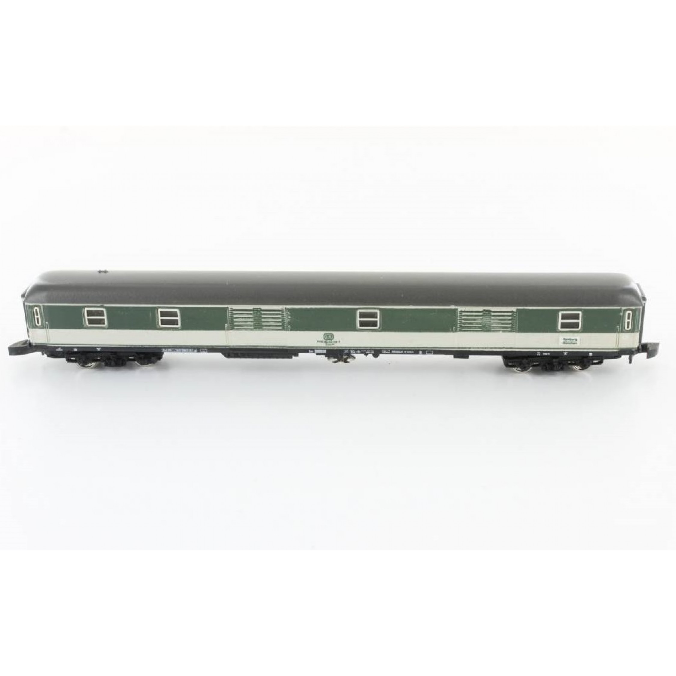 3. D-Zug-Gepäckwagen, 4achsig, grün/grau, Dach dunkelgrau, Kunststoffräder, mini-club