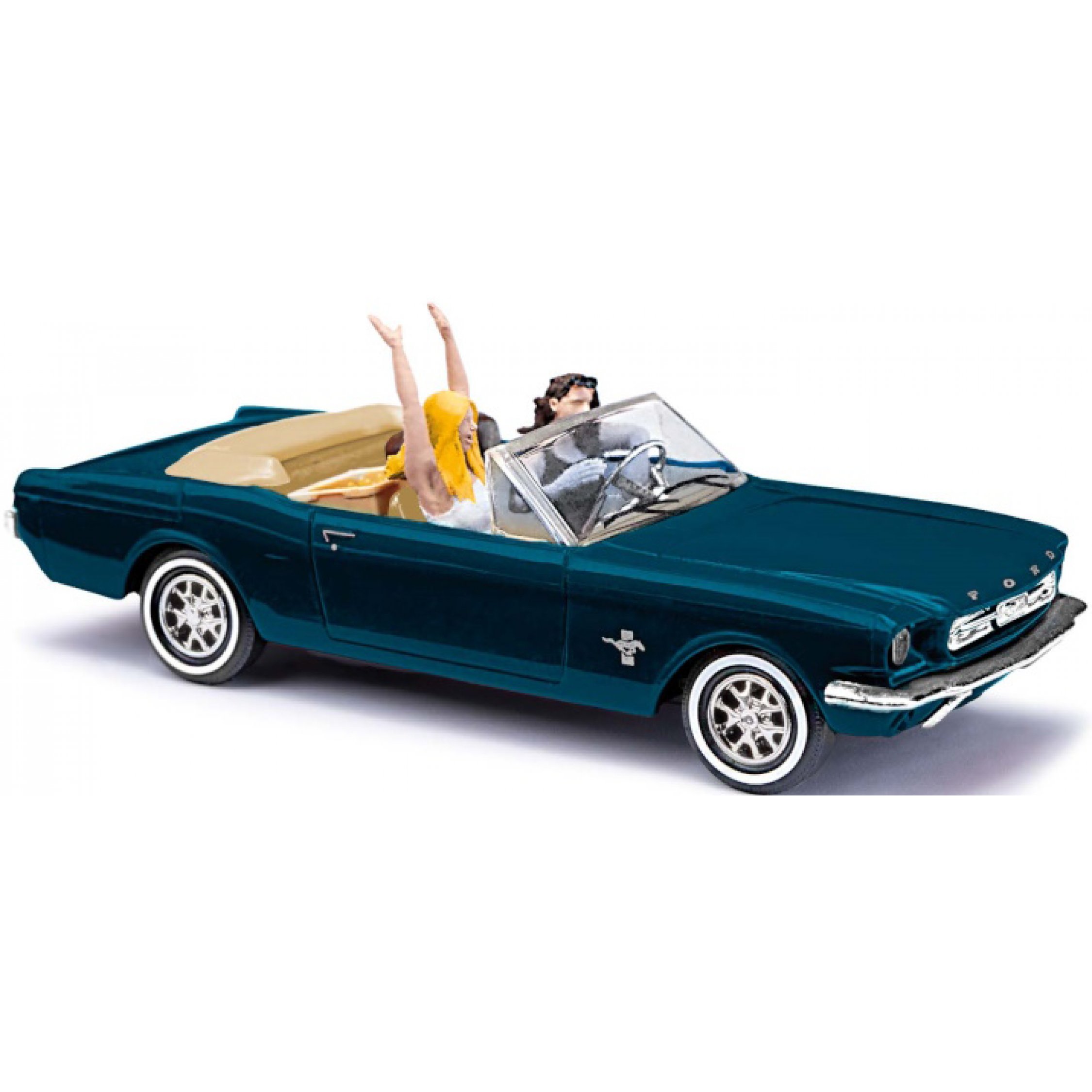 Ford Mustang Cabrio offen mit 2 Figuren, Bierkasten und Koffer, Baujahr 1964