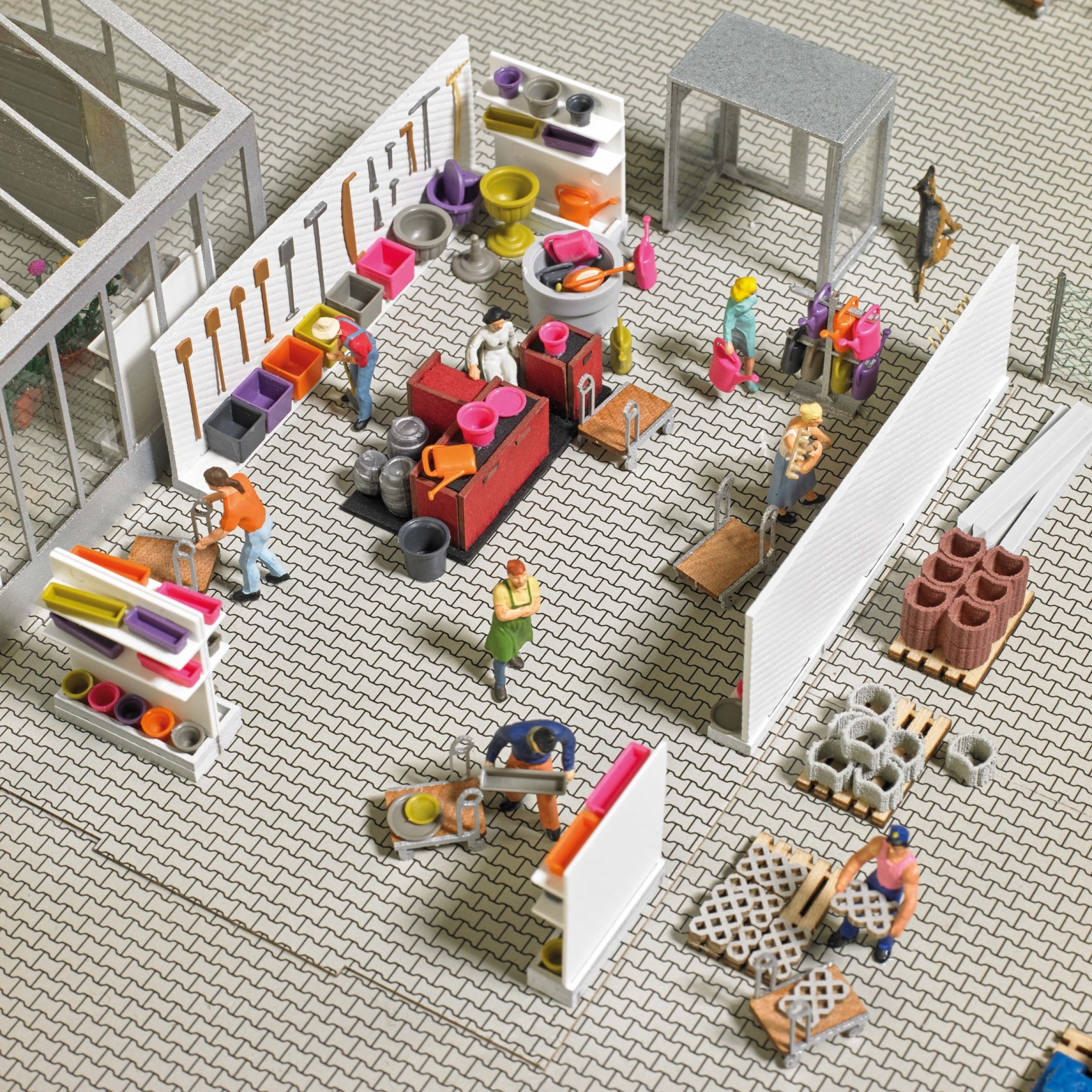 Gartencenter Einrichtung, u.a. Warenträger, Einkaufswagen, Paletten, Blumentöpfe- und Kästen, Untersetzer, Pflanzkübel, Gießkannen, Gartenwerkzeug, Säcke für Blumenerde und Rindermulch, Rasengittersteine, Bodenplatten usw.