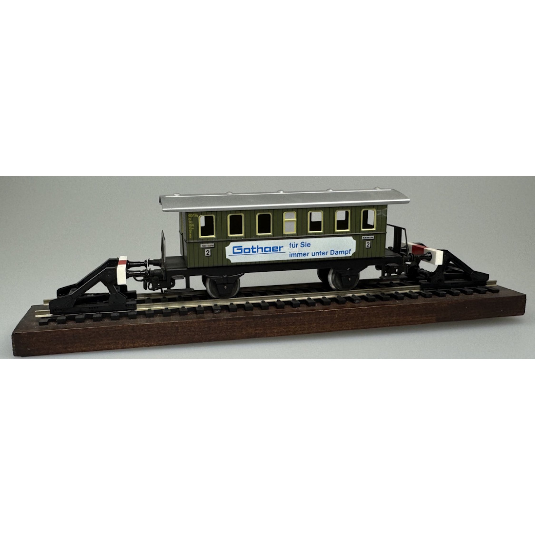 Gothaer für Sie immer unter Dampf wechselseitig mit Heinz Rückert Erkrath, 2achsiger Personenwagen aus Blech, fest montiert auf Schienensockel mit 2 Prellböcken, Modell hat keine Umverpackung