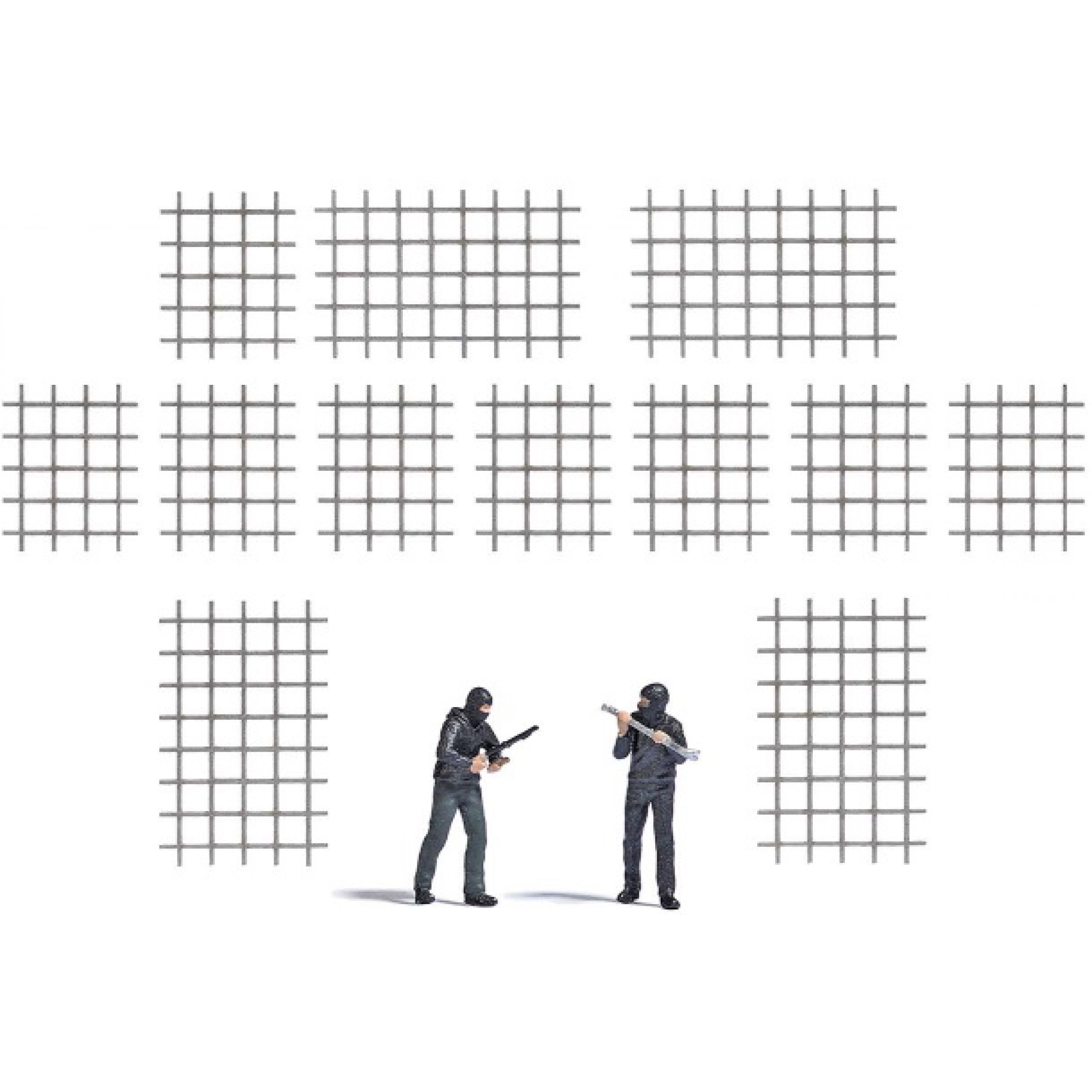 Hauseinbruch, 2 Einbrecher mit Einbruchwerkzeug bei der "Arbeit", mit 12 Fenstergittern zum Anbringen an Gebäuden in verschiedenen Größen