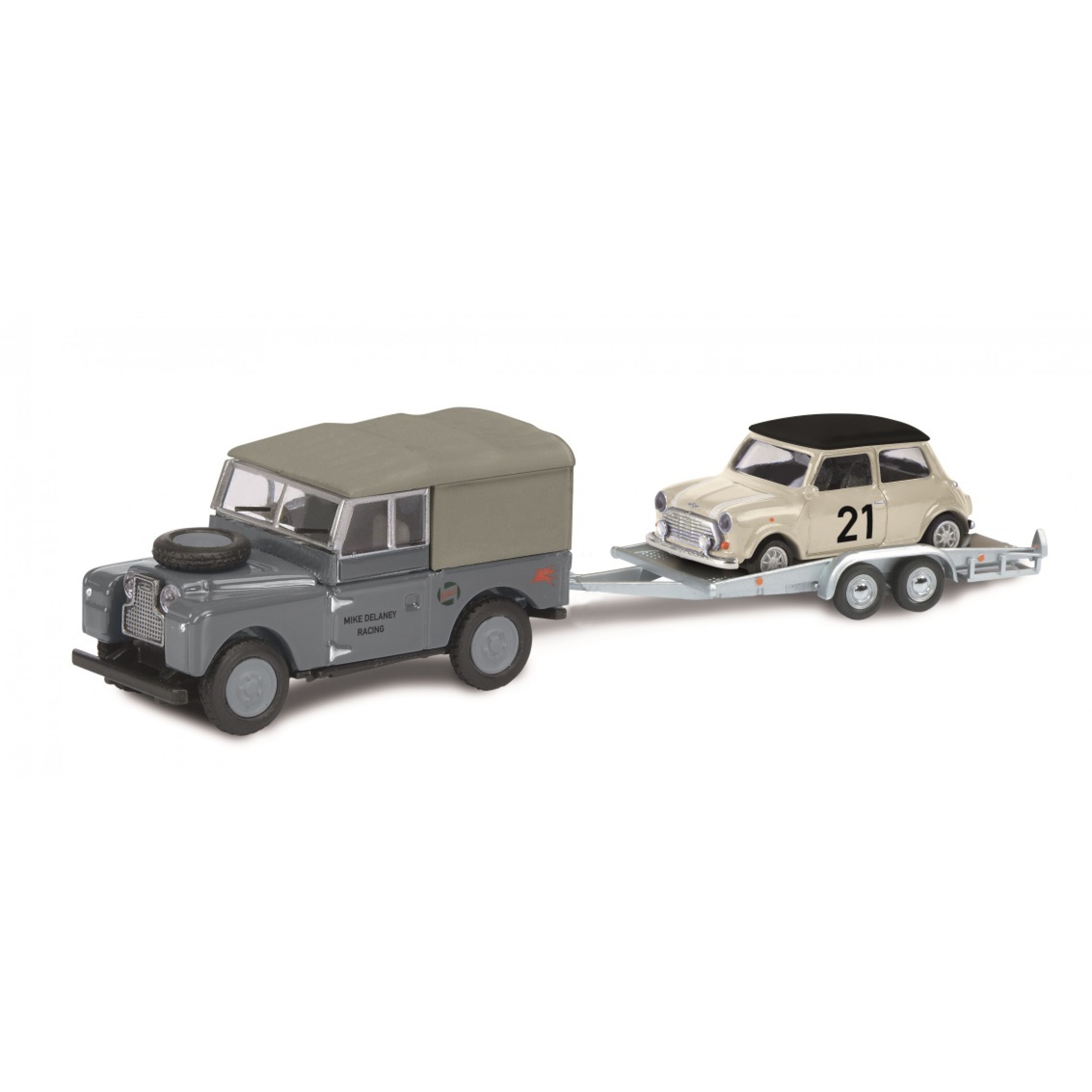 Land Rover I mit Autoanhänger beladen mit Mini Cooper