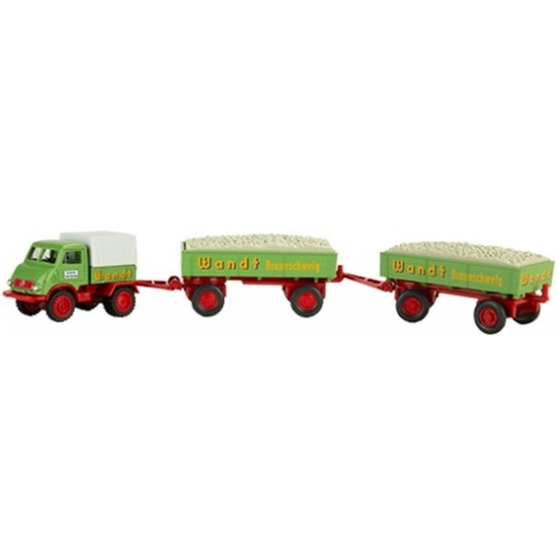 Mercedes-Benz Unimog 402 mit 2 Anhängern und Kiesbeladung, Spedition Wandt