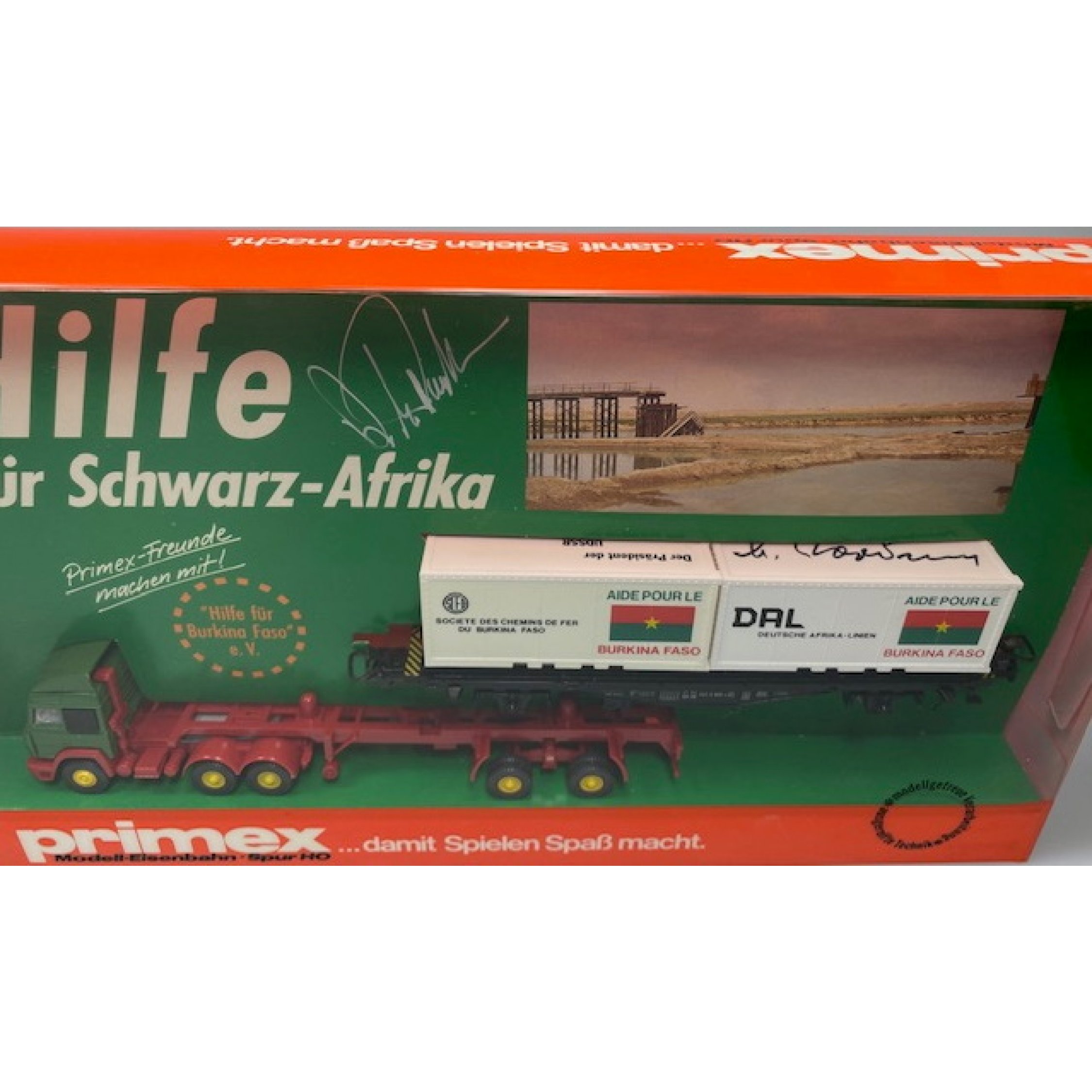 Michael S. Gorbatschow Präsident der UDSSR mit Originalunterschrift und Druck auf dem Dach, mit Zertfikat, DAL Burkina Faso, Containerwagen mit 2 abnehmbaren Containern, beiliegend Wiking Sattelzug, Sehr selten ! ORIGINAL ! Gesamtauflage 10 Stück !