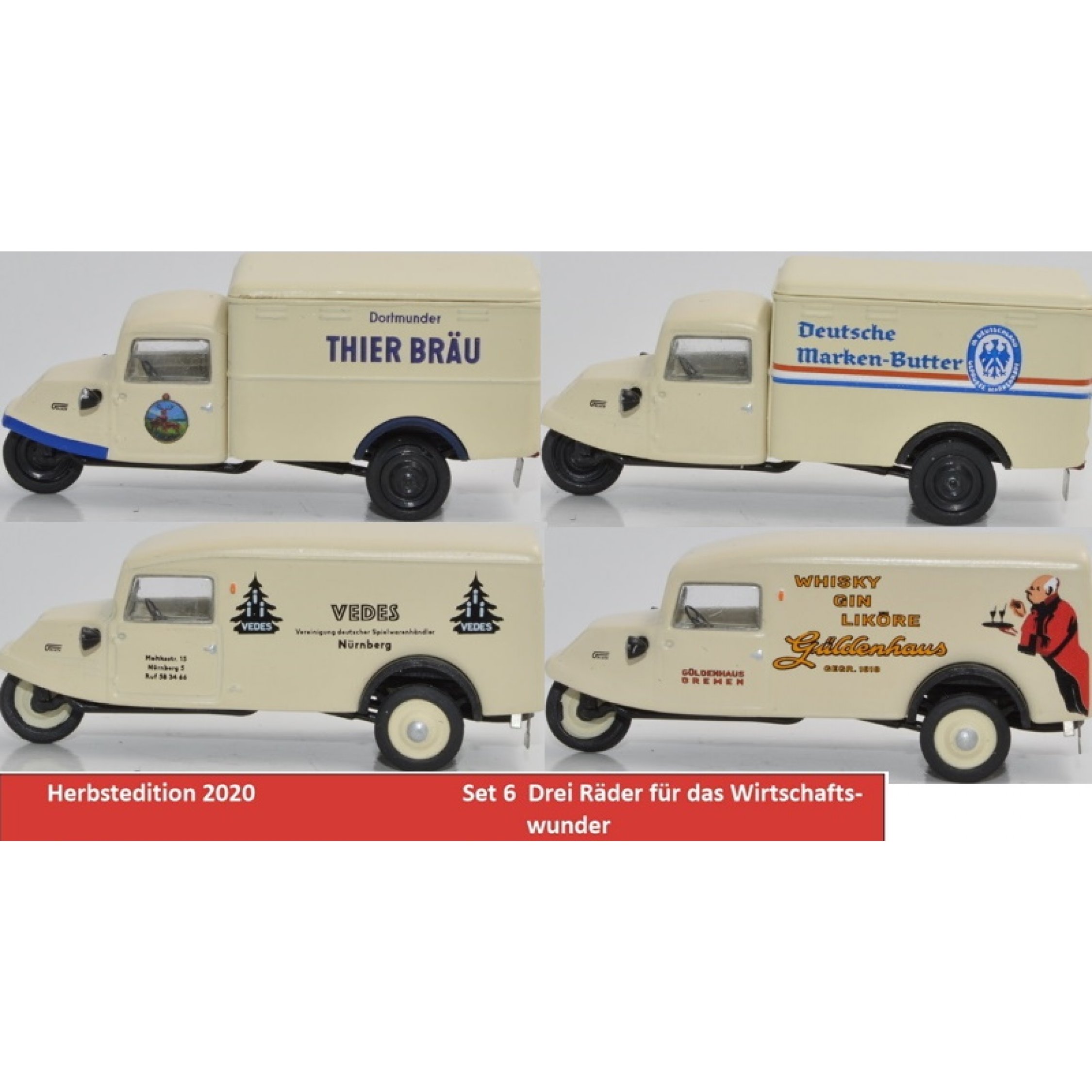 Set Wirtschaftswunder 4-teilig, Goliath GD 750: Dortmunder Thier Bräu, Deutsche Marken Butter, VEDES, Güldenhaus Whisky
