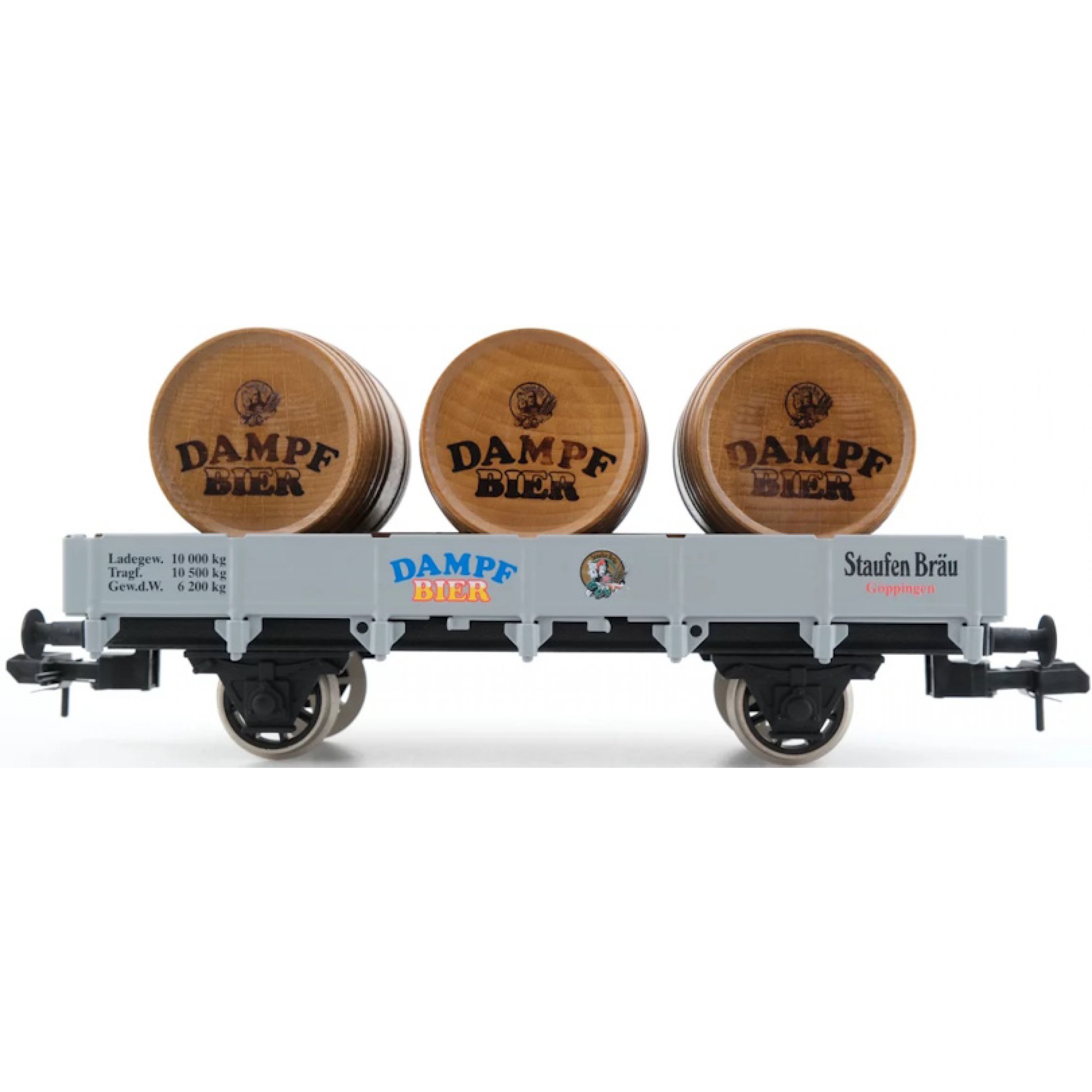 Staufen Bräu Göppingen Dampfbier, Niederbordwagen beladen mit 3 Holzfässern, Spur 1