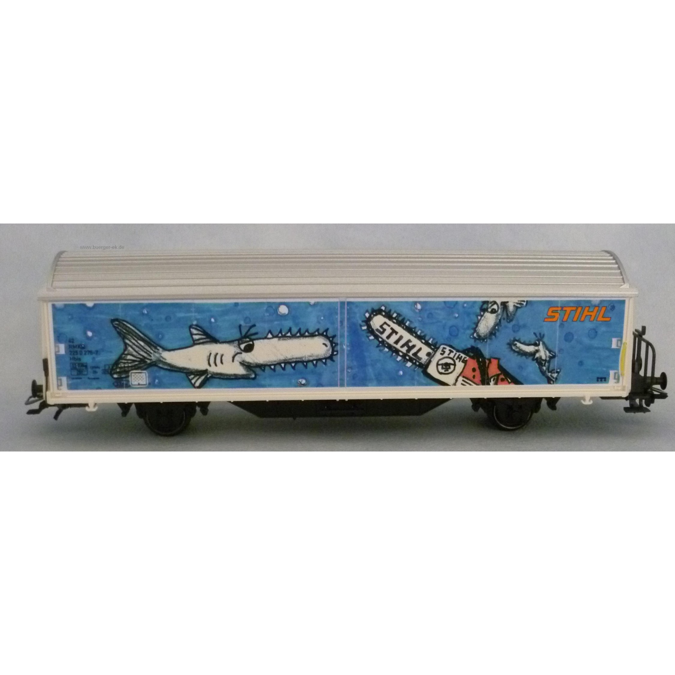 Stihl (Schiebewandwagen, seitlich blau mit Abb.Kettensäge und 'Sägefisch')