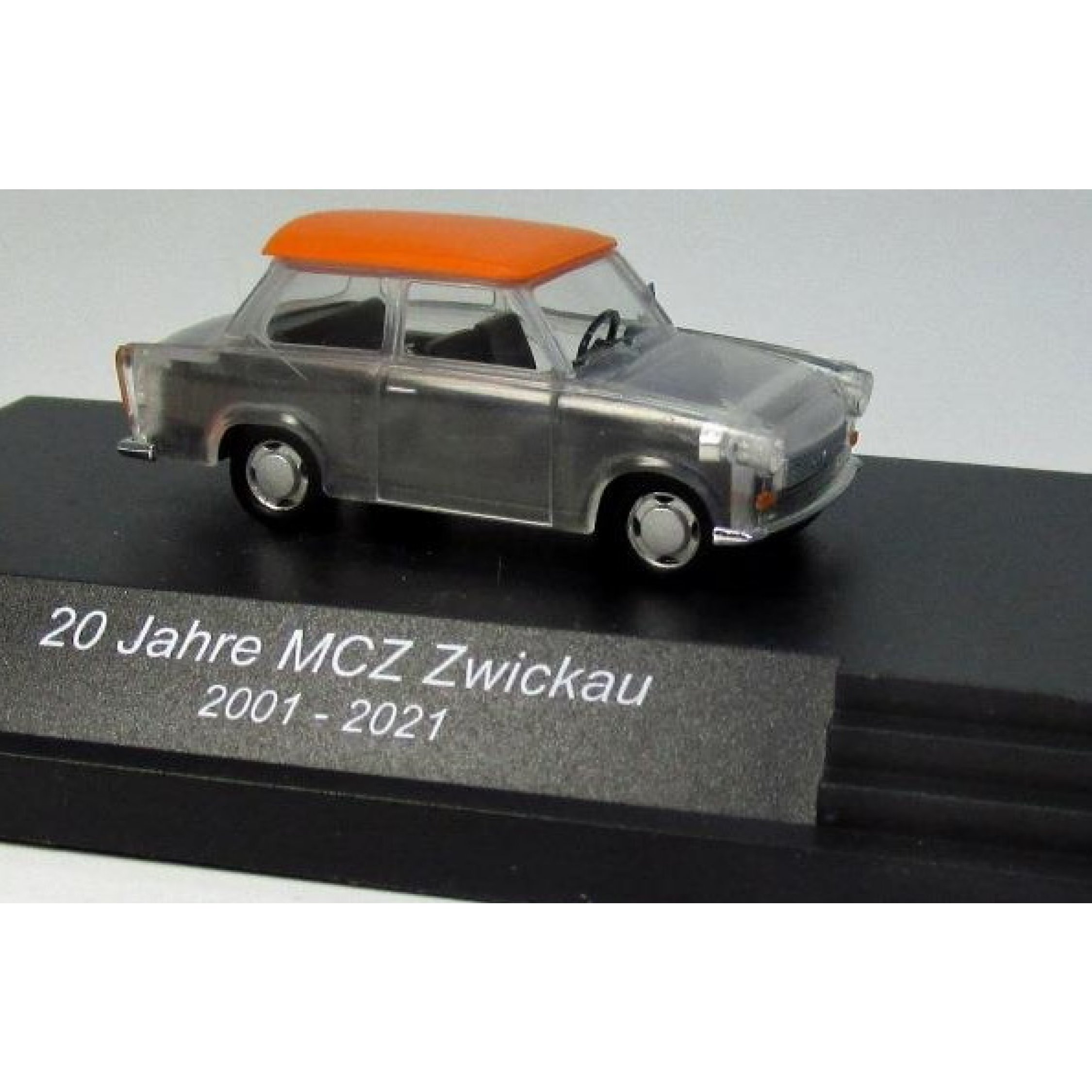 Trabant P601, Modell transparent mit orangenem Dach und bedrucktem Dekor, in Dekovitrine, 20 Jahre MCZ