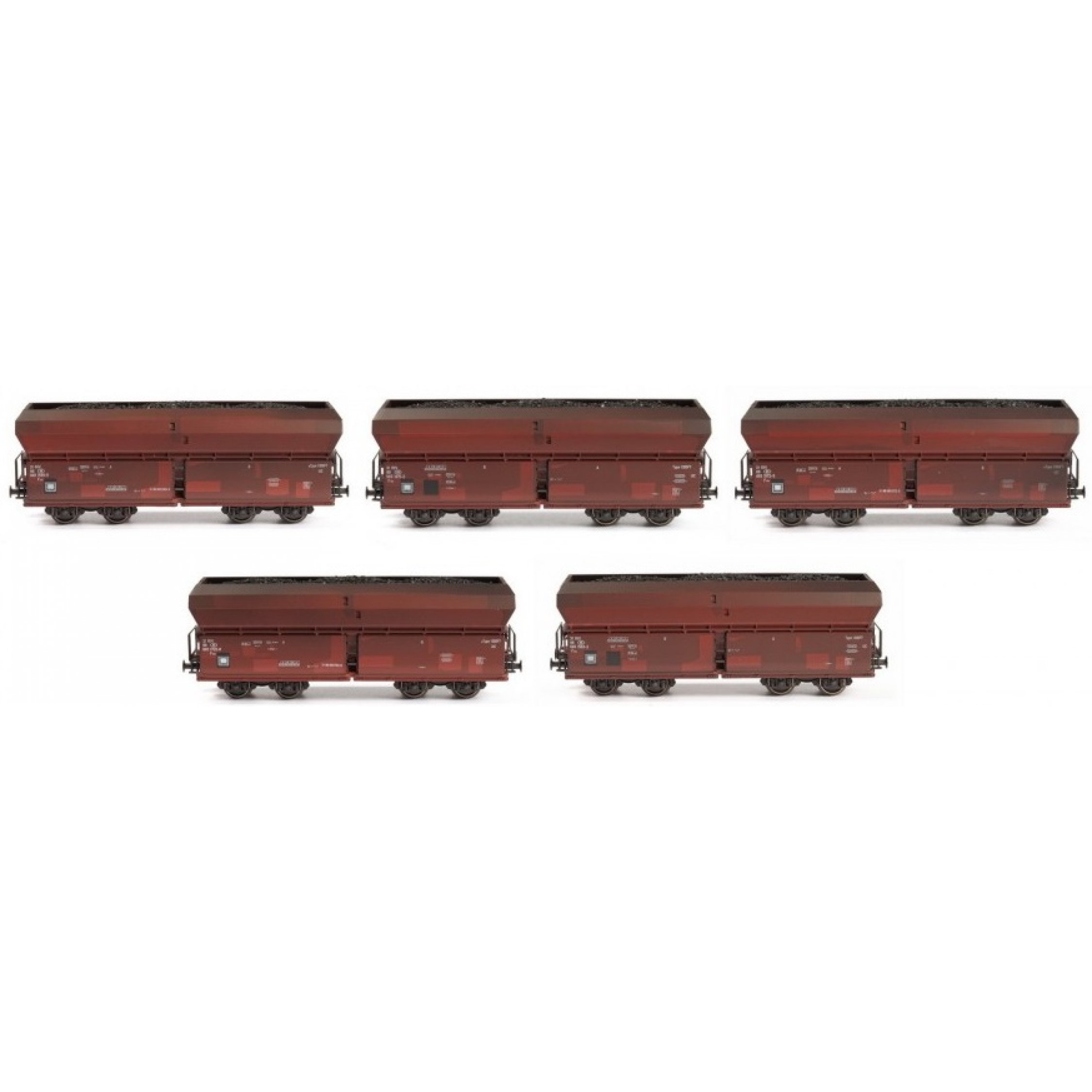 Wagenset 5 Seitenentlade-Kohlewagen der SNCB, Belgien, gealterte Ausführung, unterschiedliche Wagennummern, Beladungseinsätze mit echter Steinkohle