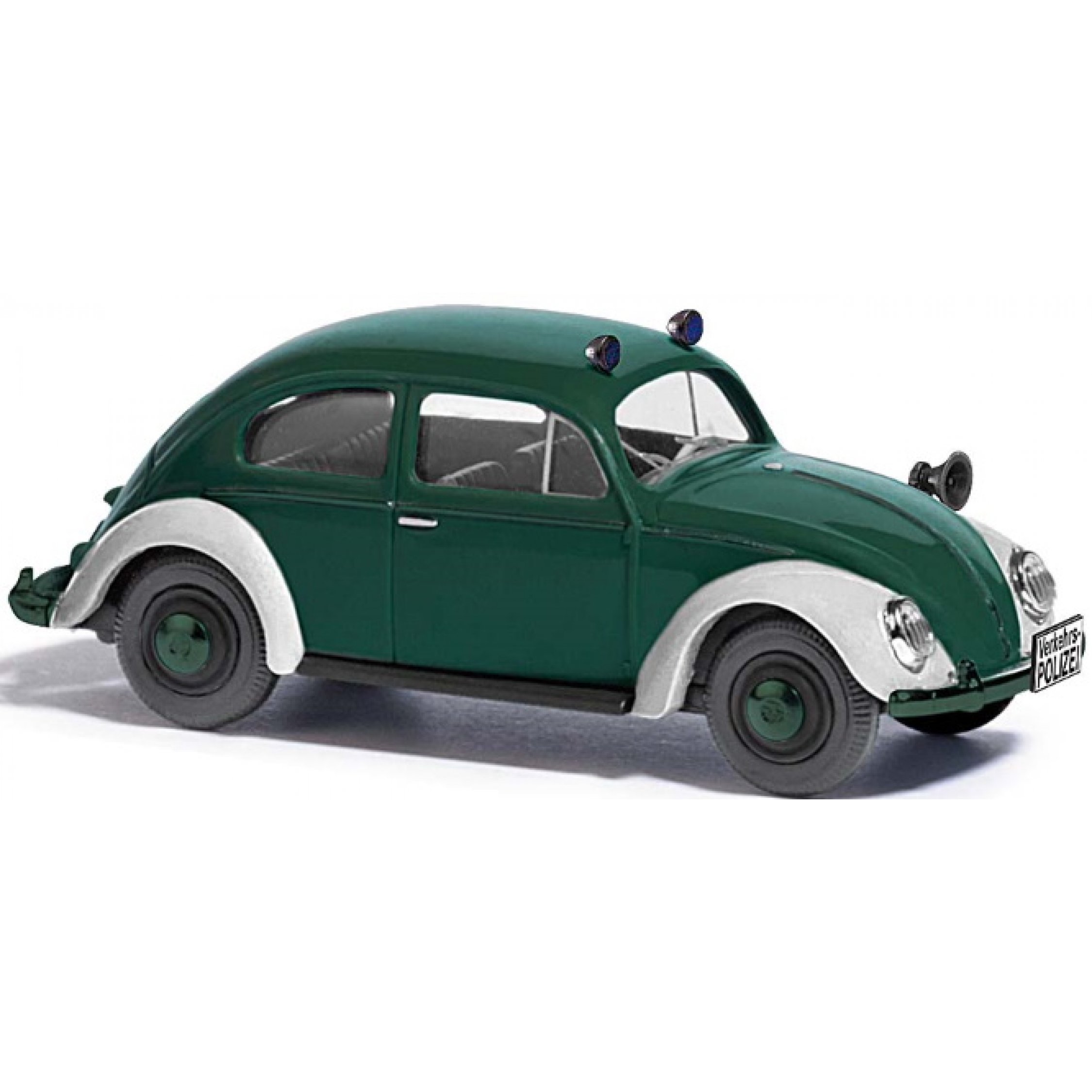 VW Käfer mit Ovalfenster der Polizei, dunkelgrün/weiß, Baujahr 1955