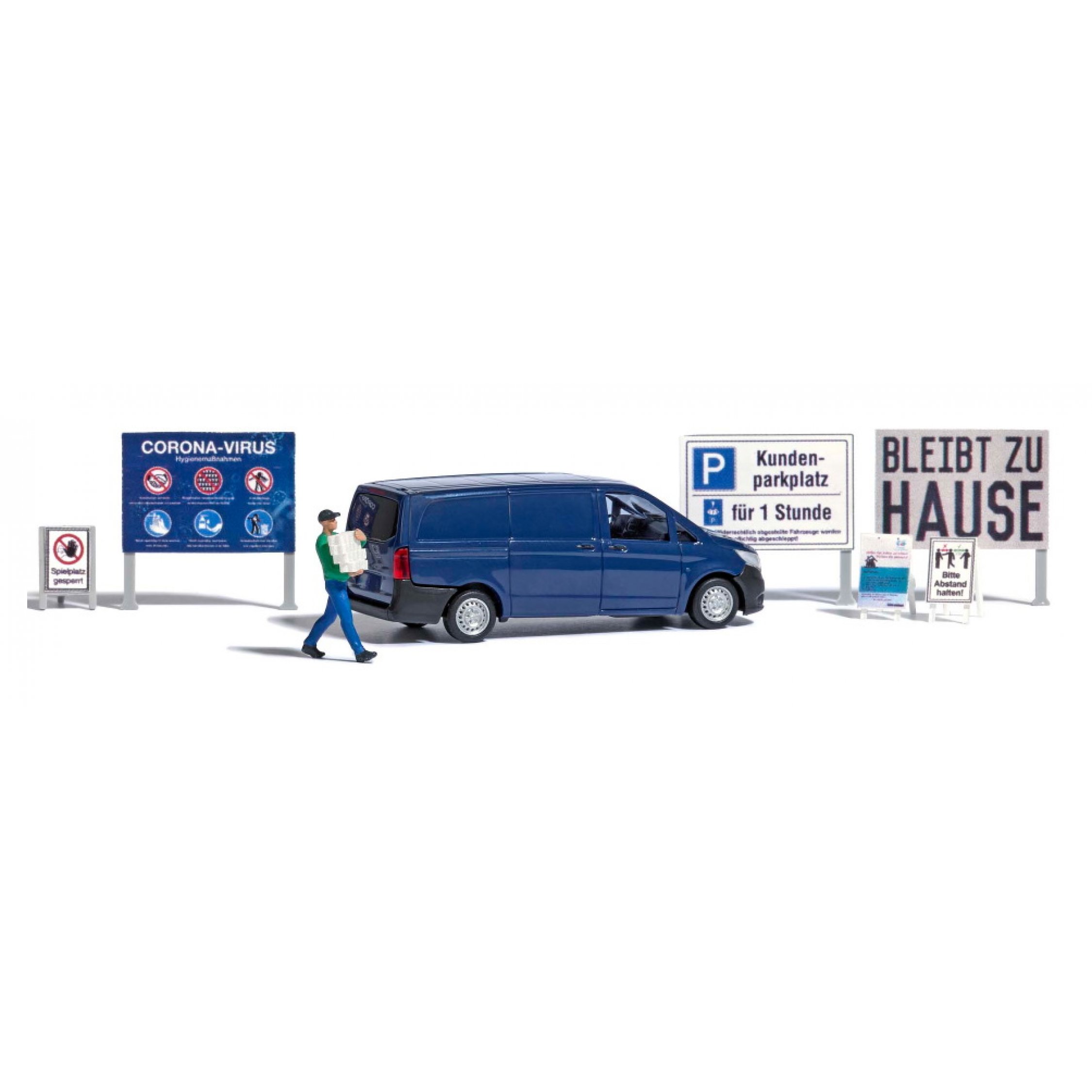 Corona-Pandemie: Mercedes-Benz Vito Bus mit Figur und passender Beschilderung, Erwin beim Hamsterkauf von Toilettenpapier