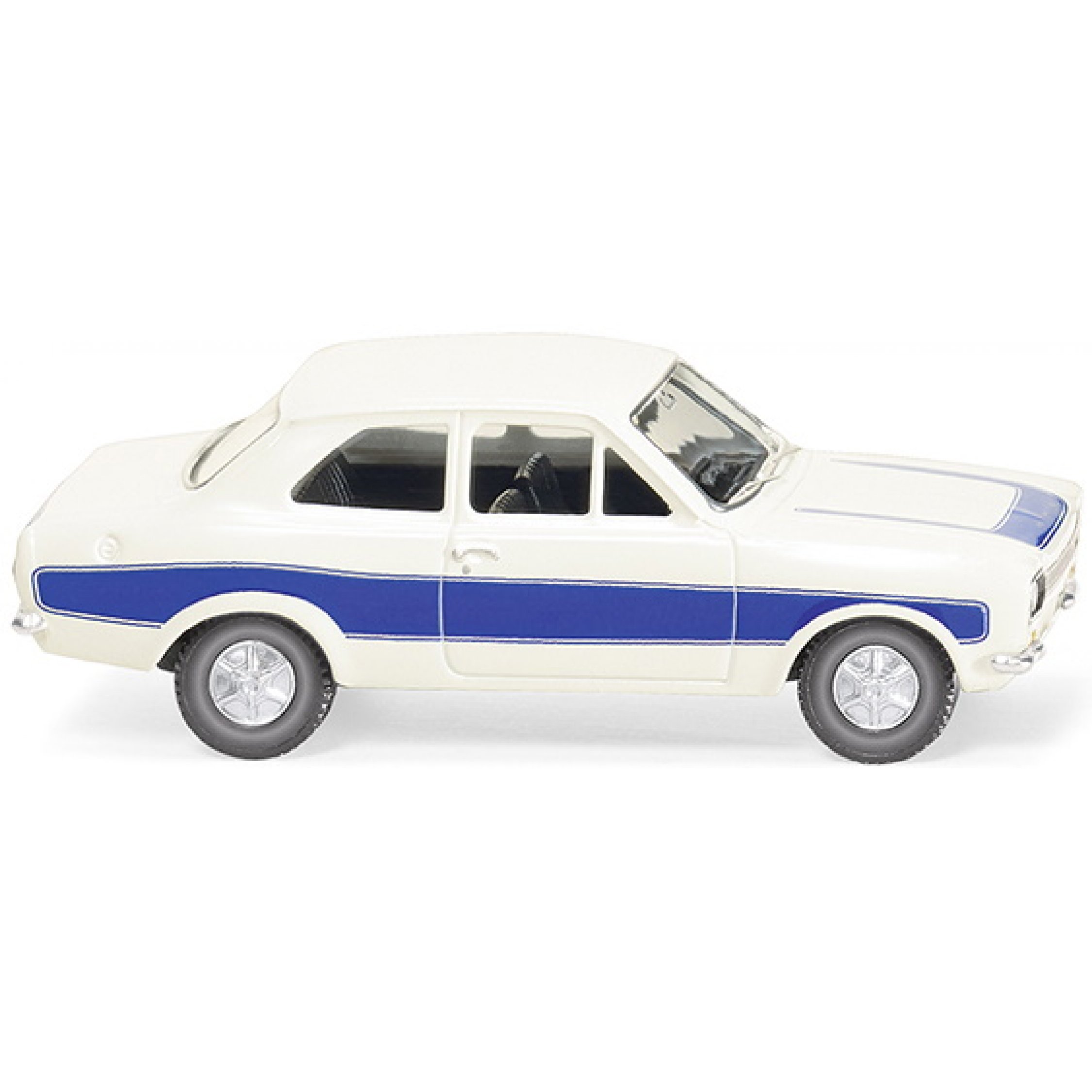 Ford Escort, weiß mit blauem Streifen, Baujahr 1968-74