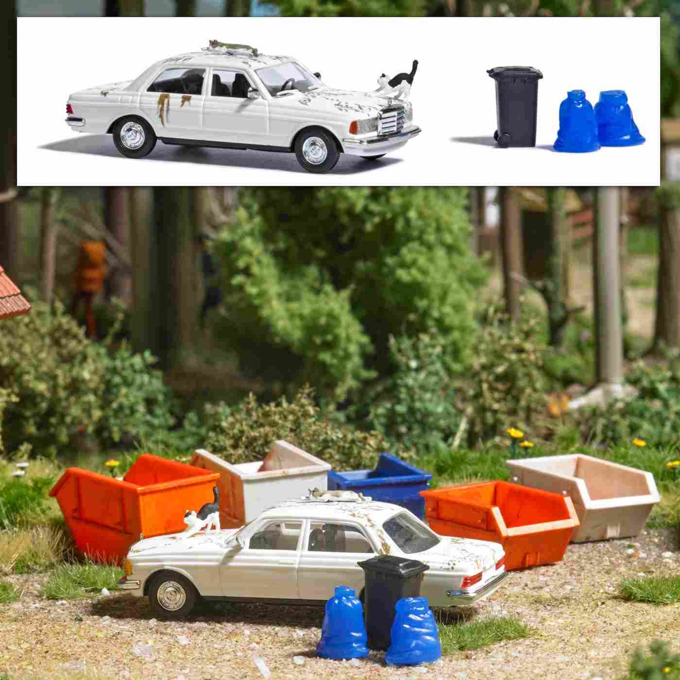 4. Katzenauto: 2 Katzen auf Mercedes-Benz W123 Limousine mit Spuren von Pfoten, mit Mülltonne und Müllsäcken