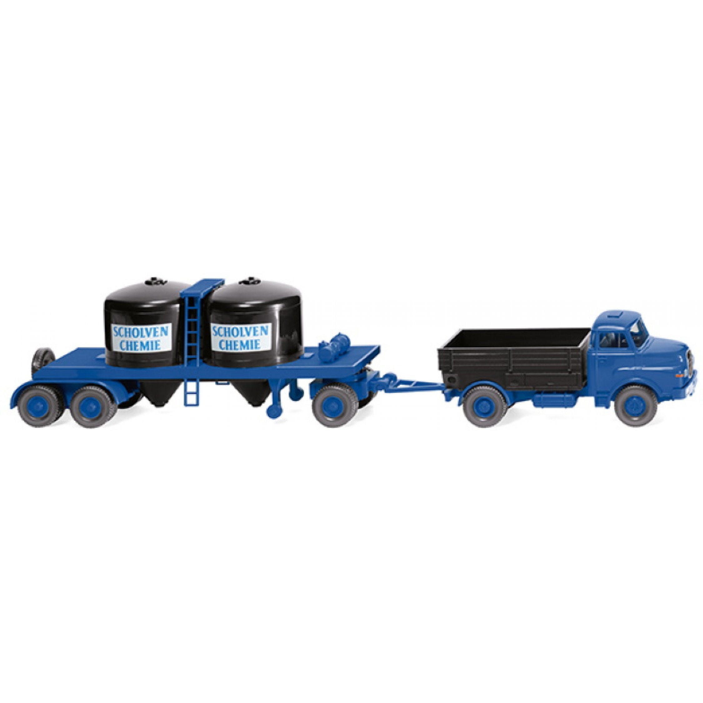 MAN Fronthauber Zugmaschine Pritsche mit Chemiekalienanhänger Scholven Chemie, blau/schwarz, Baujahr 1969-94