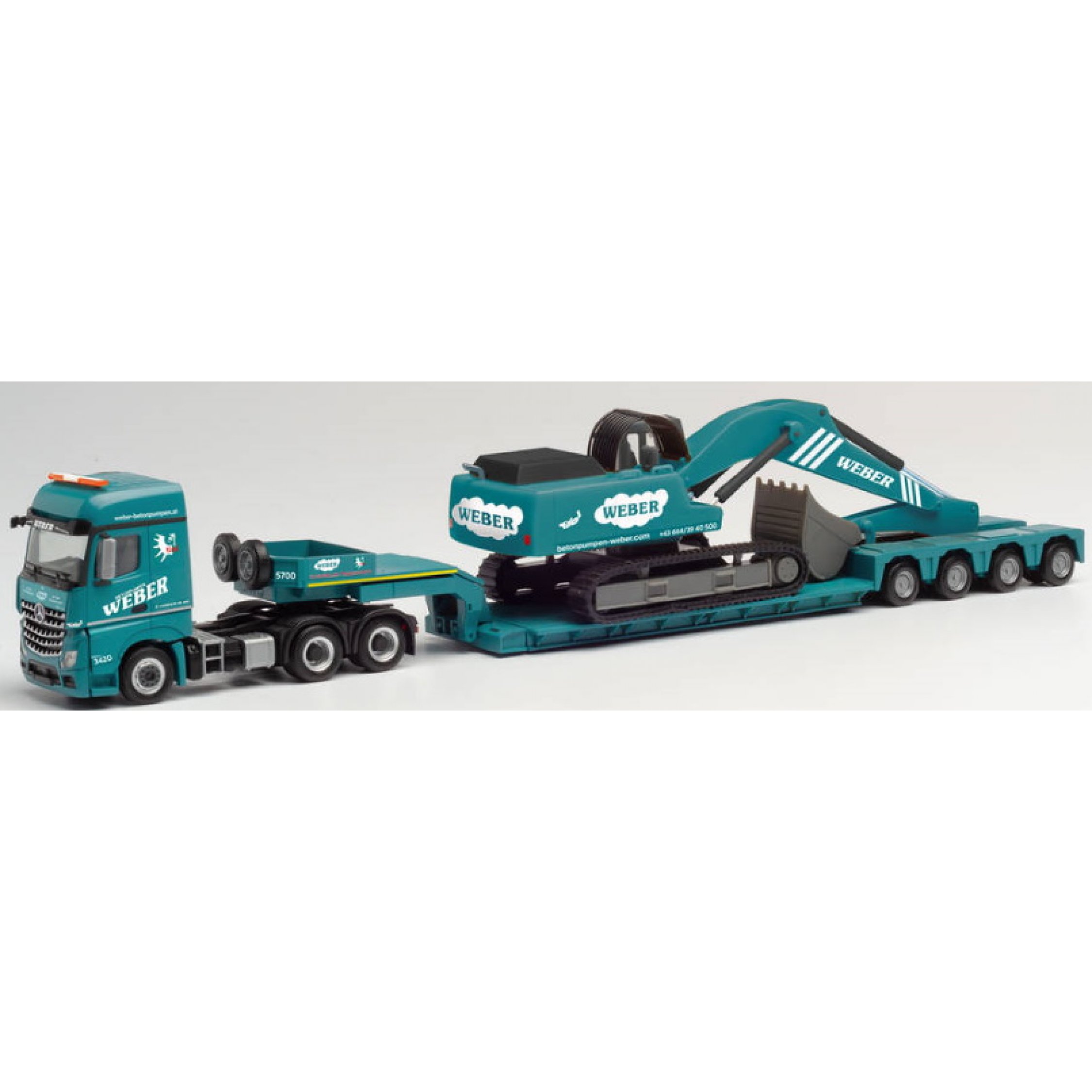 Mercedes-Benz Arocs 6x4 Tieflade-Sattelzug beladen mit Liebherr Raupenbagger, Weber Betonpumpen, Inzing - Österreich