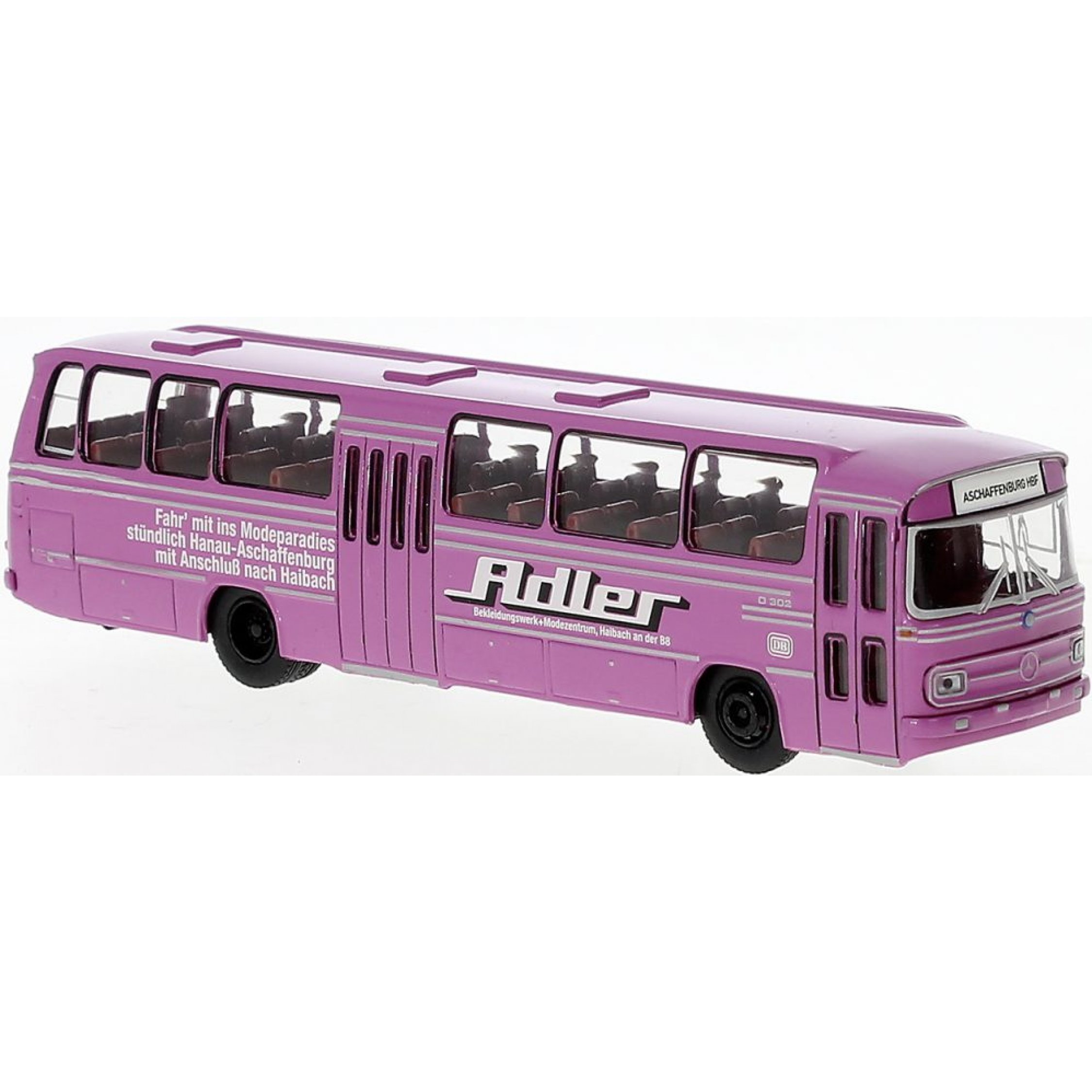 Mercedes-Benz O 302-13 RÜnh, Adler Modepark - Fahr mit ins Modeparadies stündlich Hanau-Aschaffenburg mit Anschluß nach Haibach, Baujahr 1970
