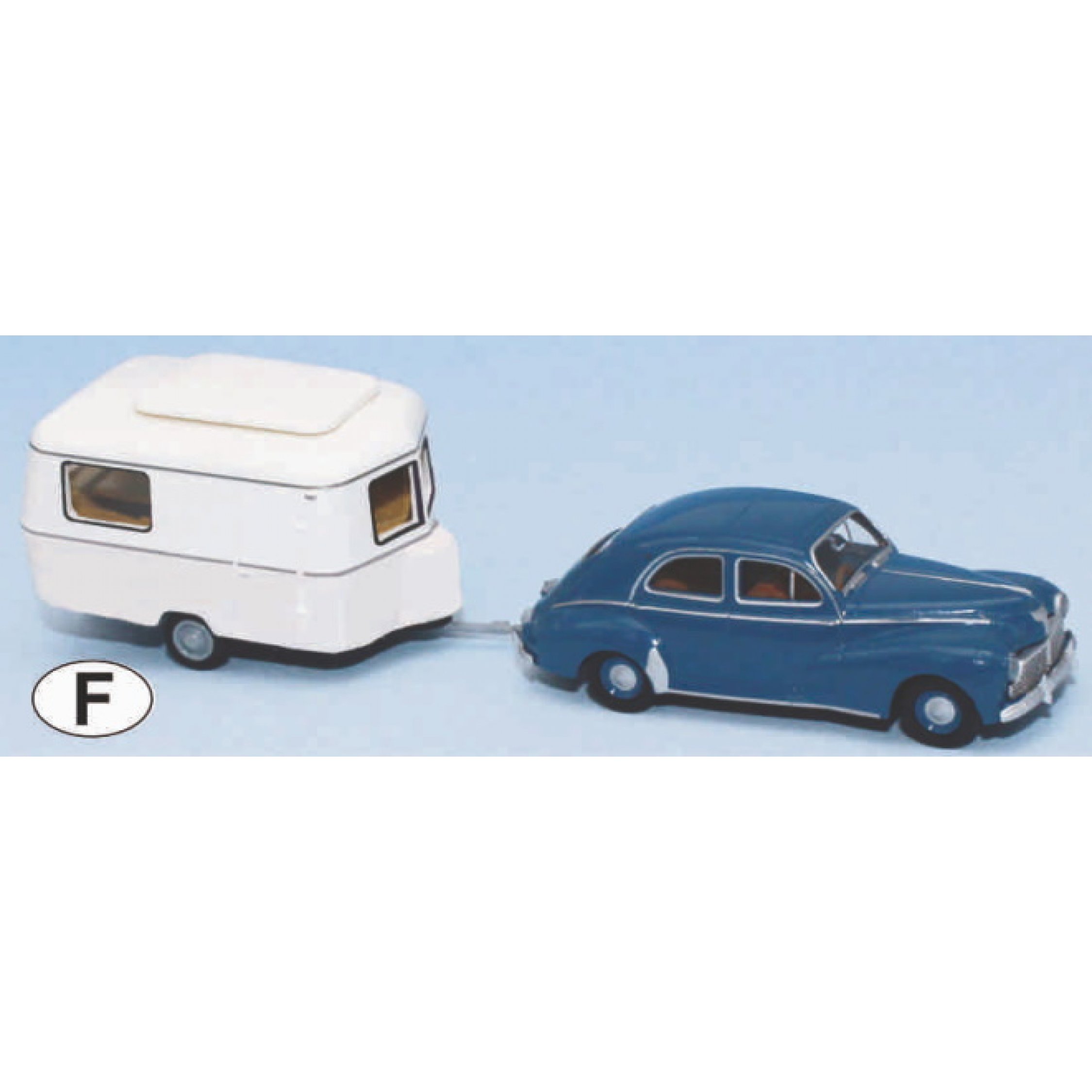Peugeot 203, azurblau mit elfenbeinfarbenem Eriba Wohnwagen, (von Brekina)