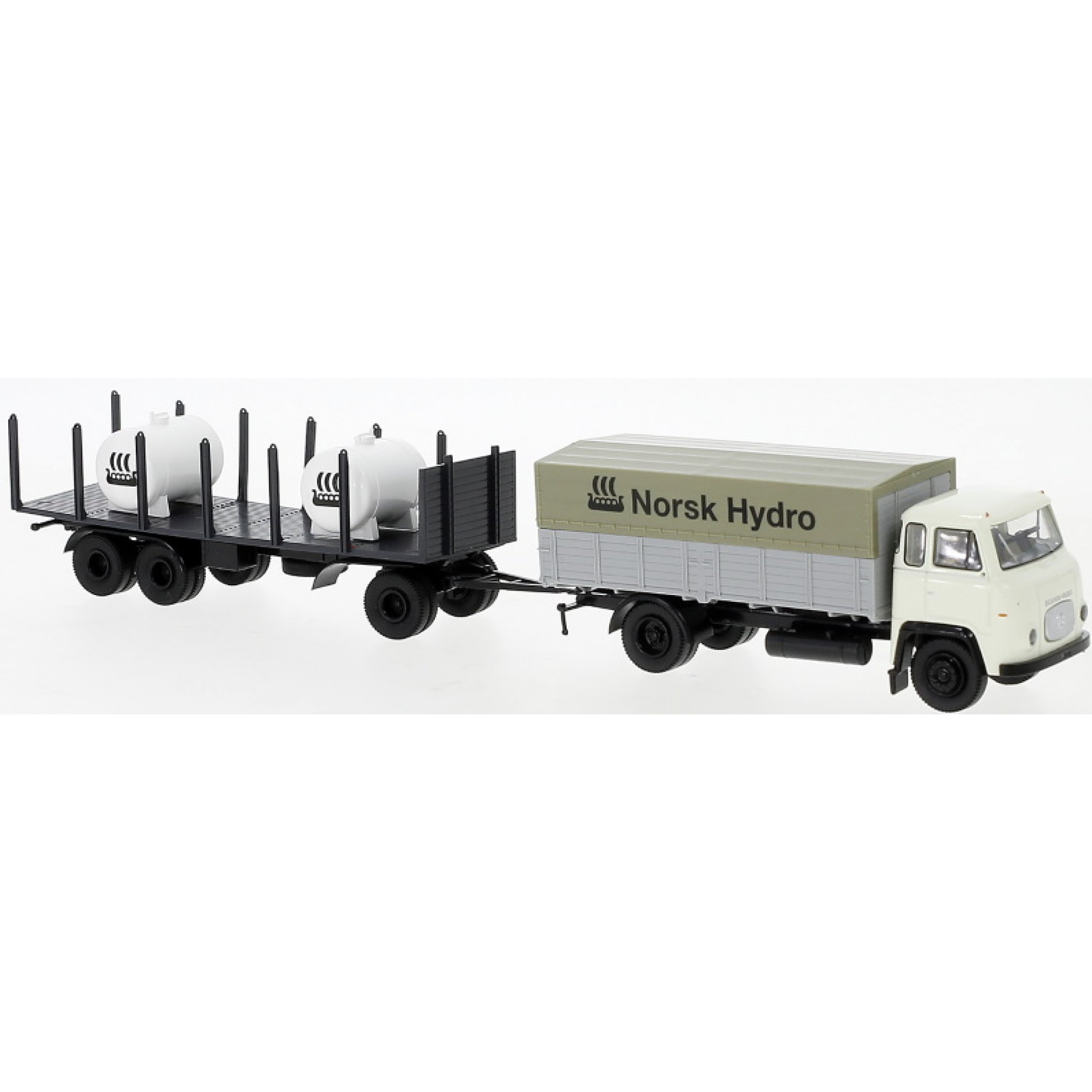 Scania LB 76 Pritsche/Plane mit Rungenanhänger beladen mit Tankbehältern, Norsk Hydro