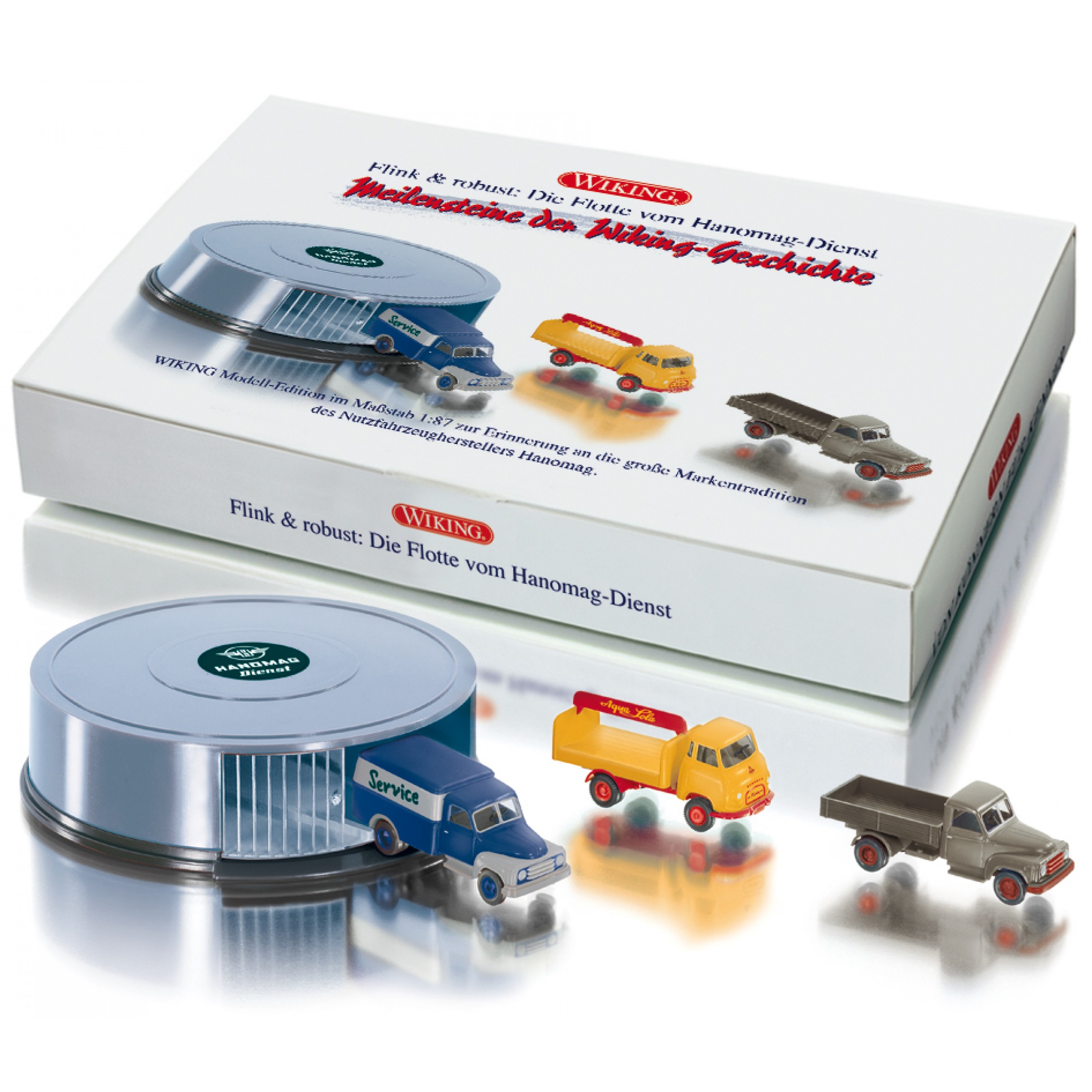 Set "Rundgarage Hanomag Dienst", Inhalt: Hanomag L28 Koffer "Hanomag Dienst", Hanomag Kurier mit Getränkeaufbau "Aqua Lola", Hanomag L28 Pritschen-LKW und Rundgarage