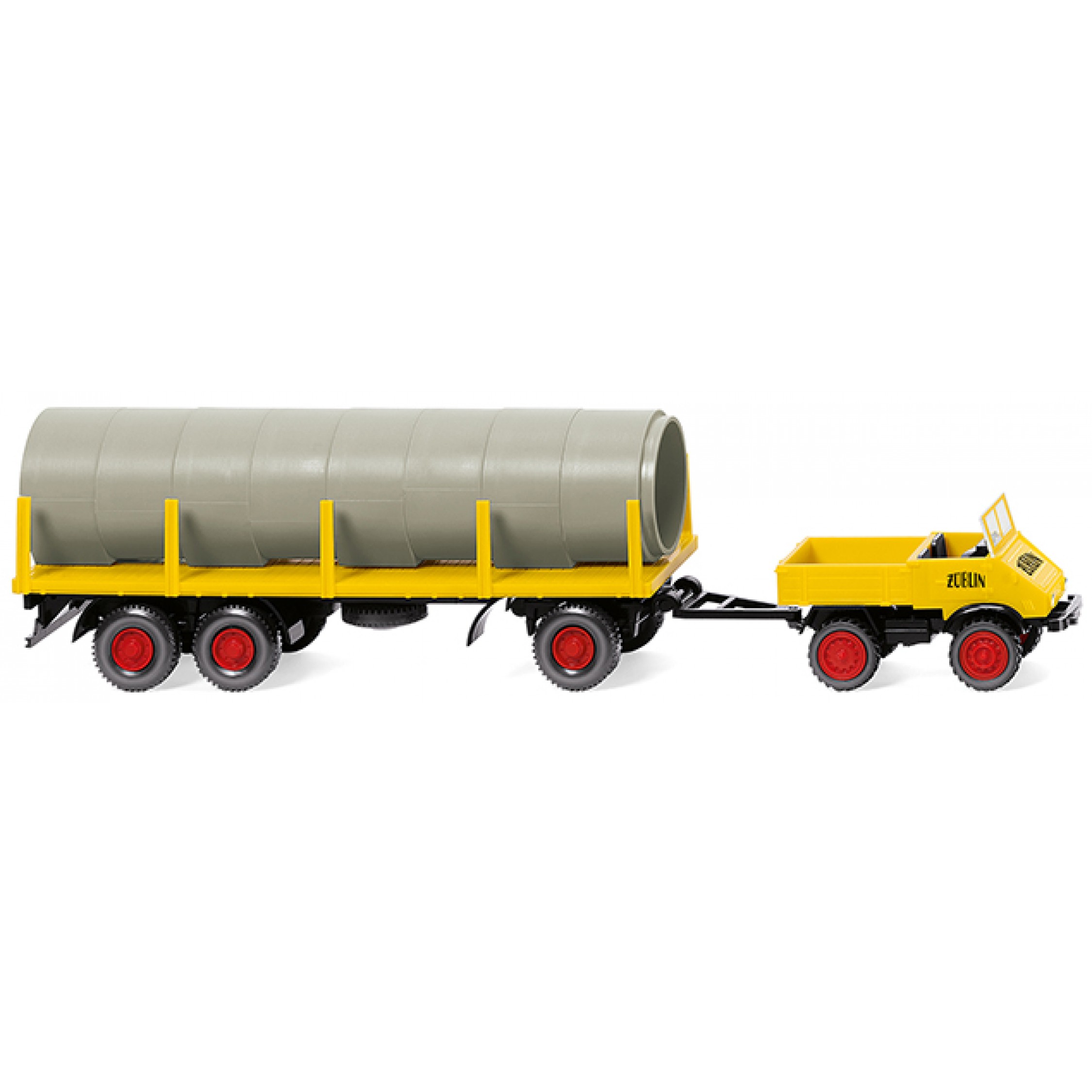 Unimog U 411 mit Rungenanhänger beladen mit Röhre, Züblin