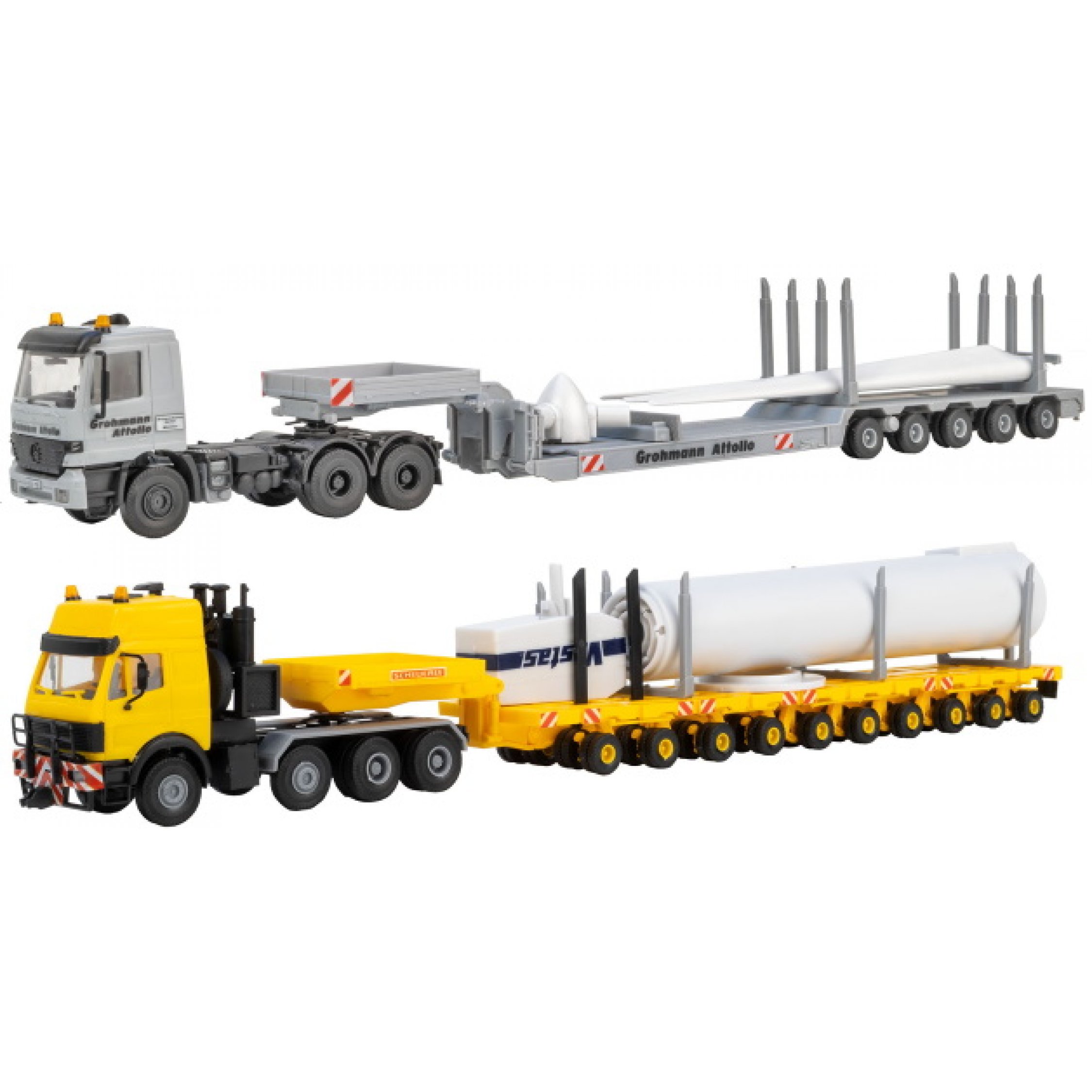 Windkraftanlagentransport: Windrad aufgeteilt auf 2 Sattelzüge, MB Actros mit Scheuerle Tiefbettauflieger und MB SK mit Scheuerleauflieger, Bausatz