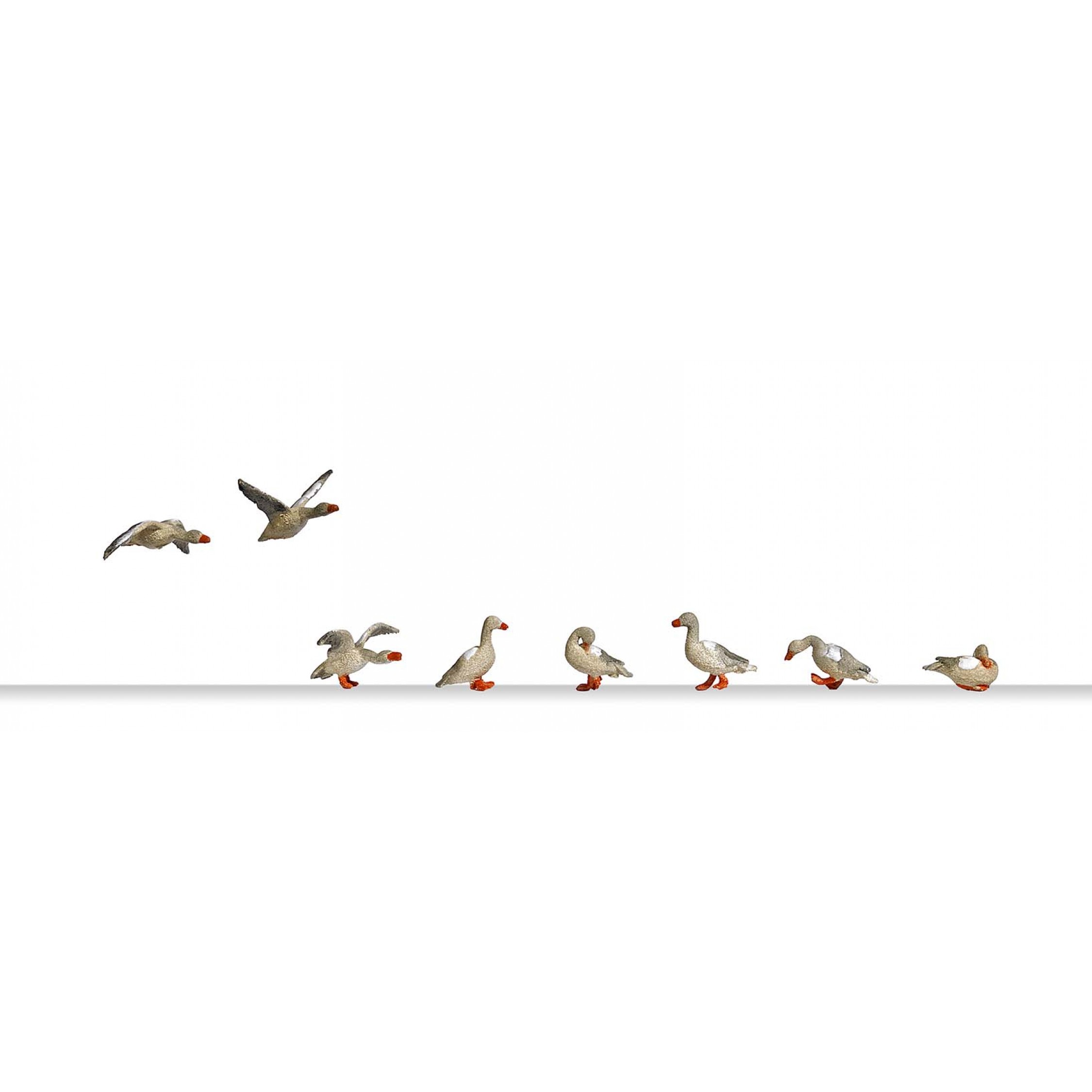 8 Wildgänse, davon 2 fliegend und eine attackierend, Fertigmodelle