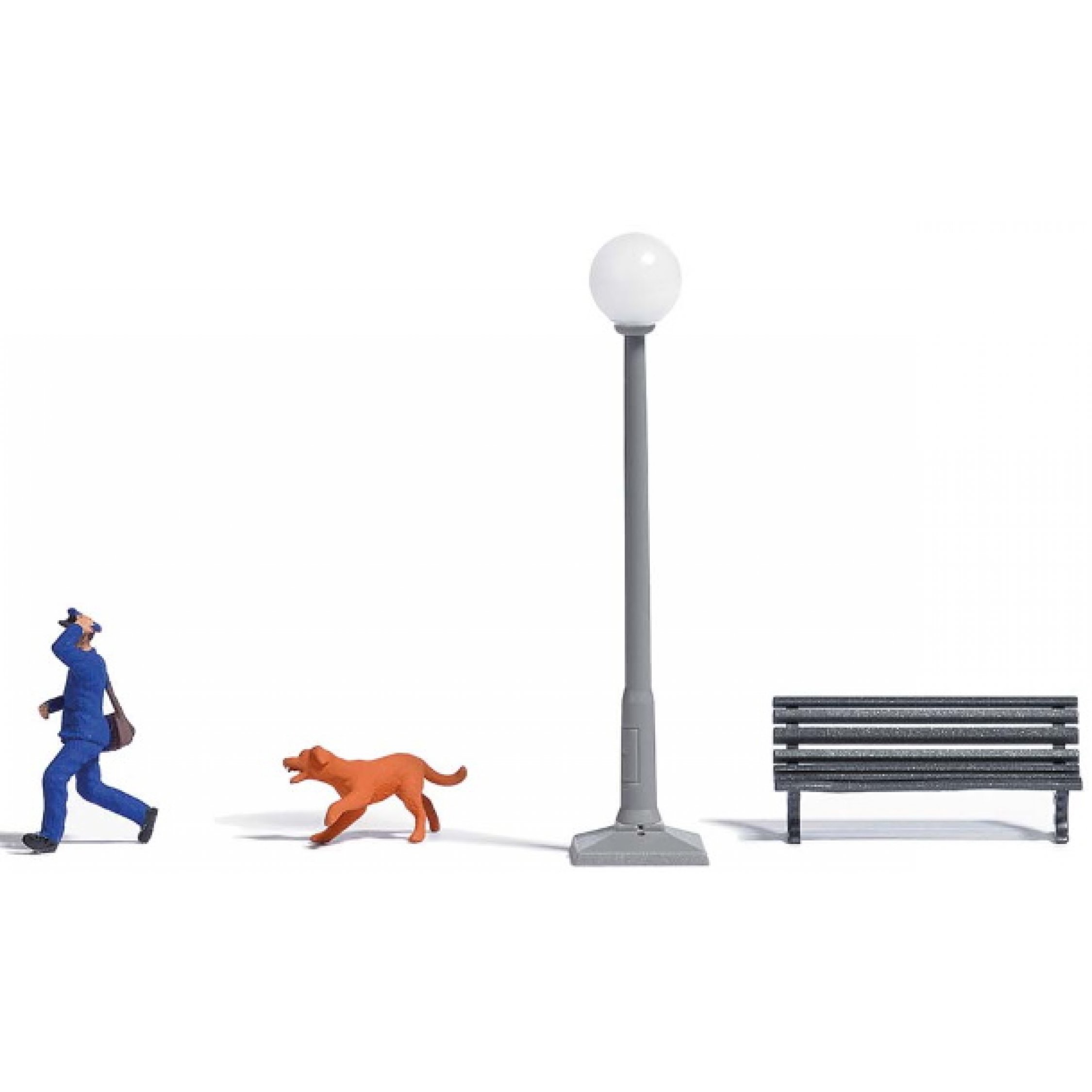 4. Auf der Flucht - Briefträger, der vor einem Hund flüchtet, mit Parkbank und Parkleuchte