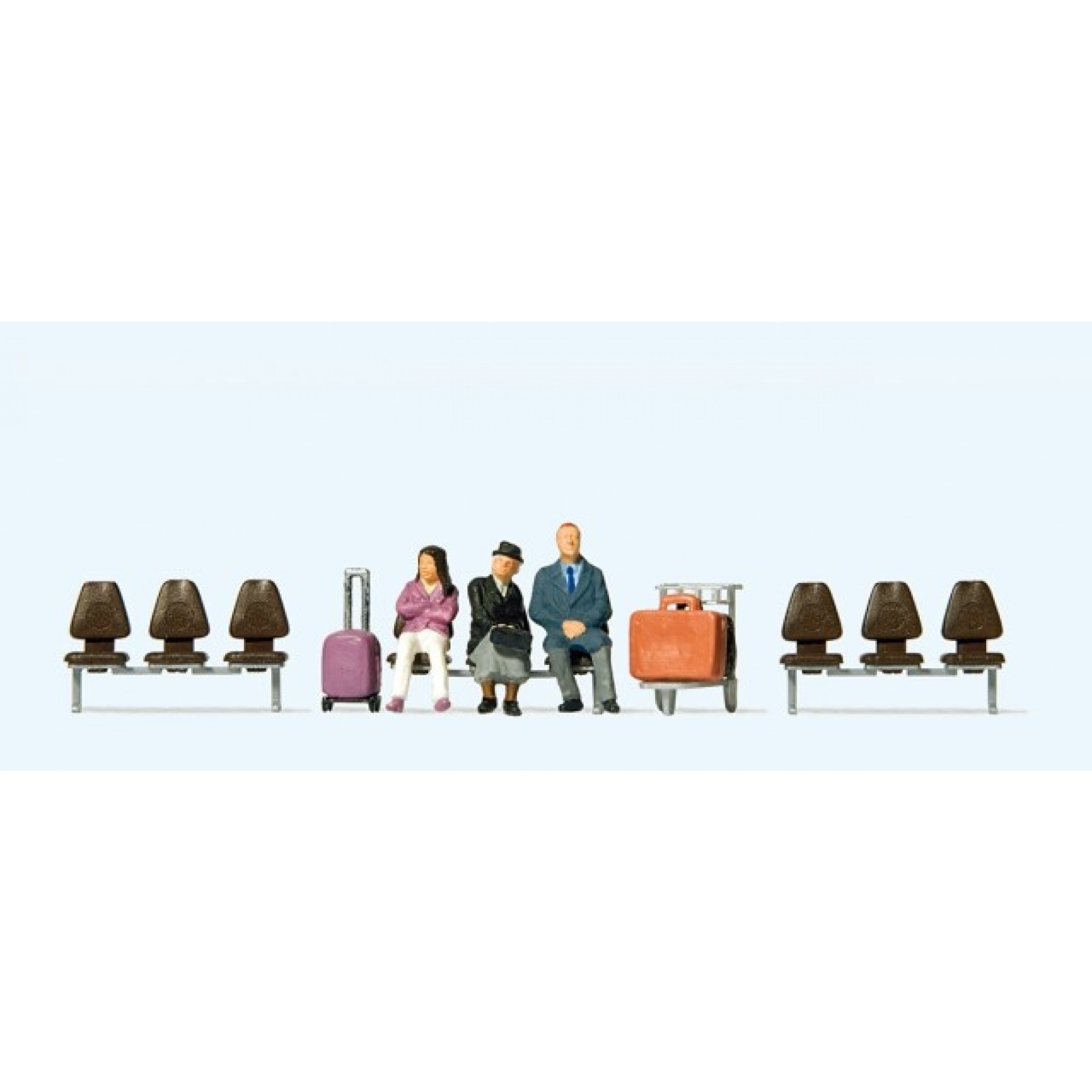 Drei wartende Reisende, Kofferkuli, drei Sitzreihen