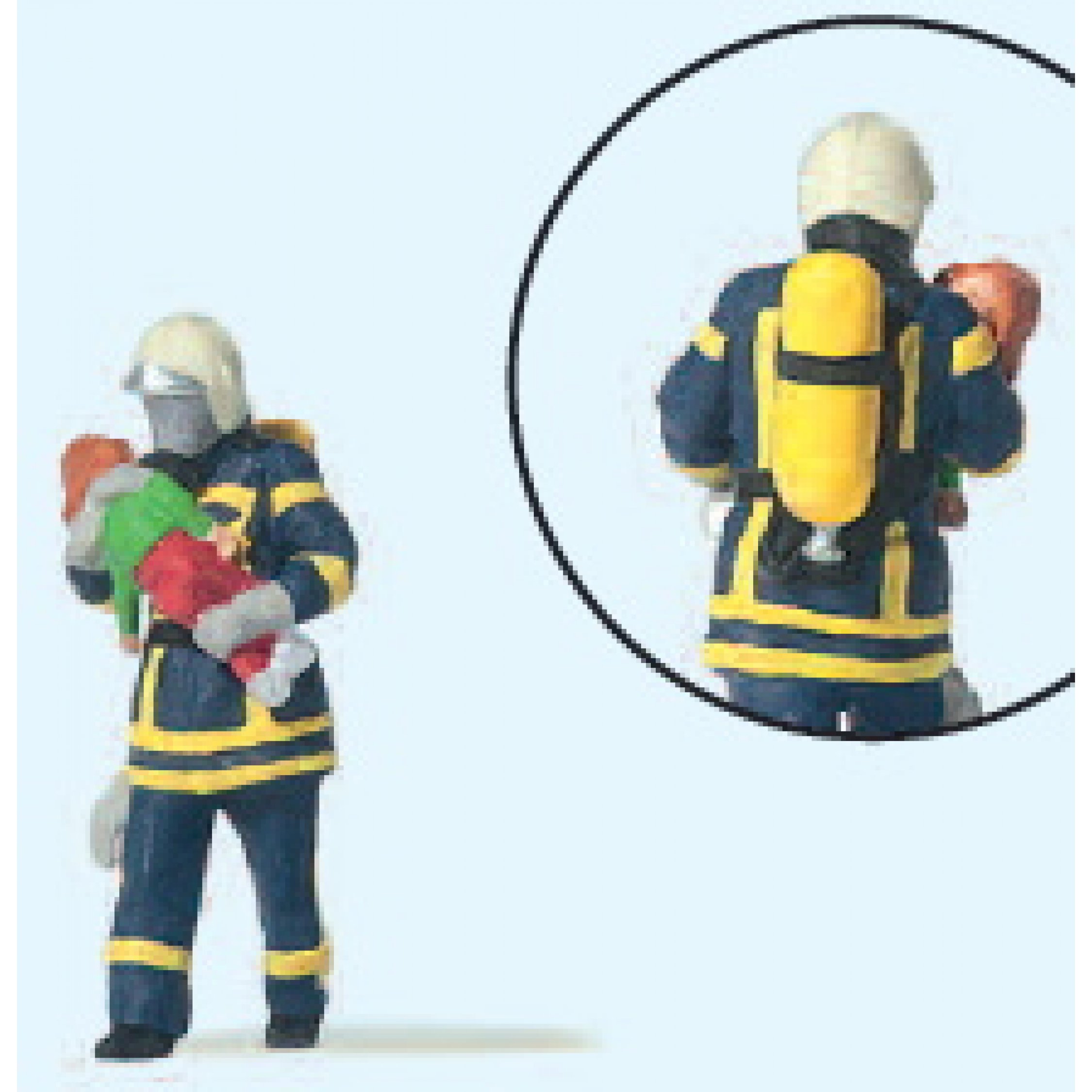 4. Feuerwehrmann, Kind rettend. Blaue Uniform