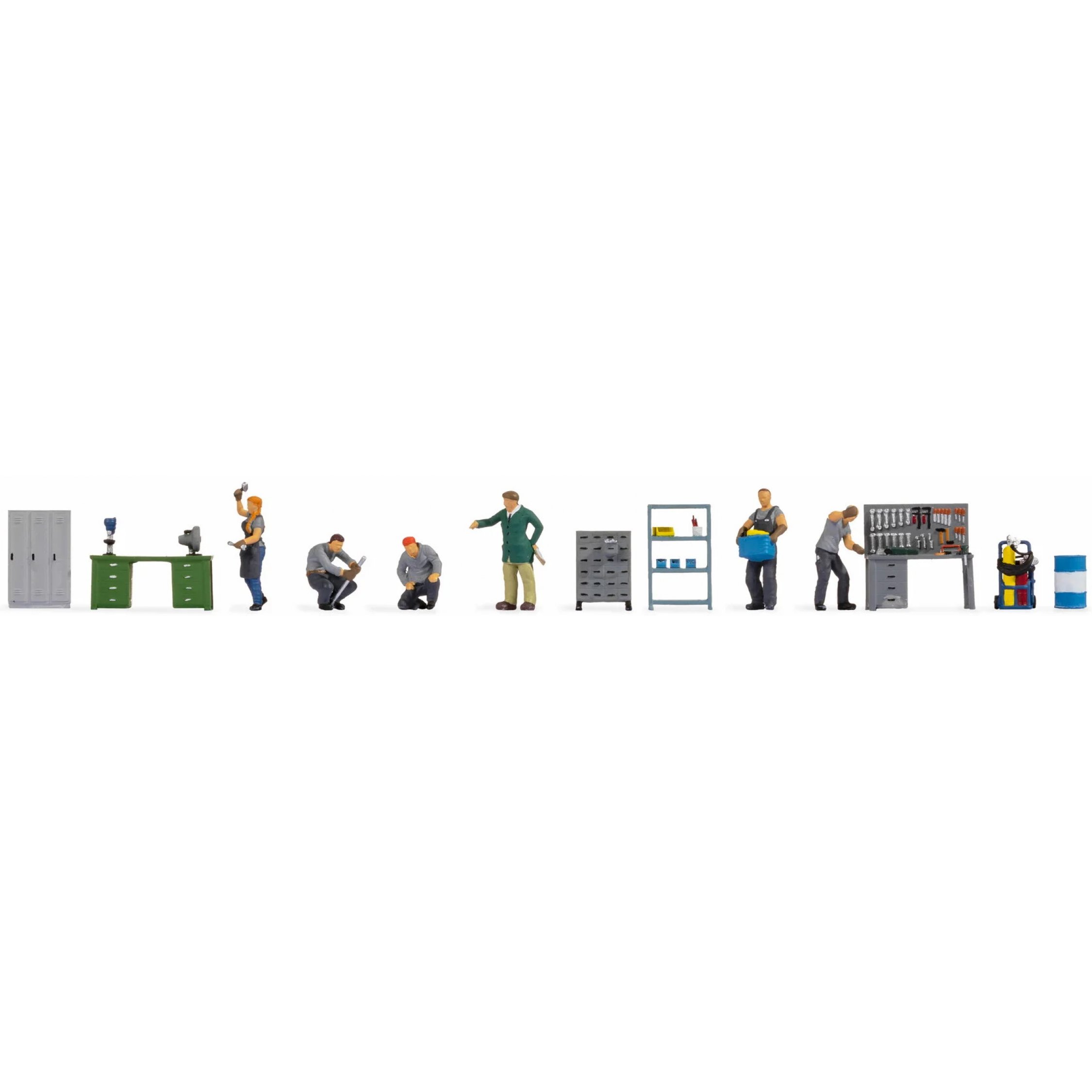 Figuren-Themenwelt Werkstatt, Inhalt: 6 Arbeiter, 2 Werkbänke, Metallschrank, Aktenschrank, Metallregal, Schweißausräusrüstung, Fass