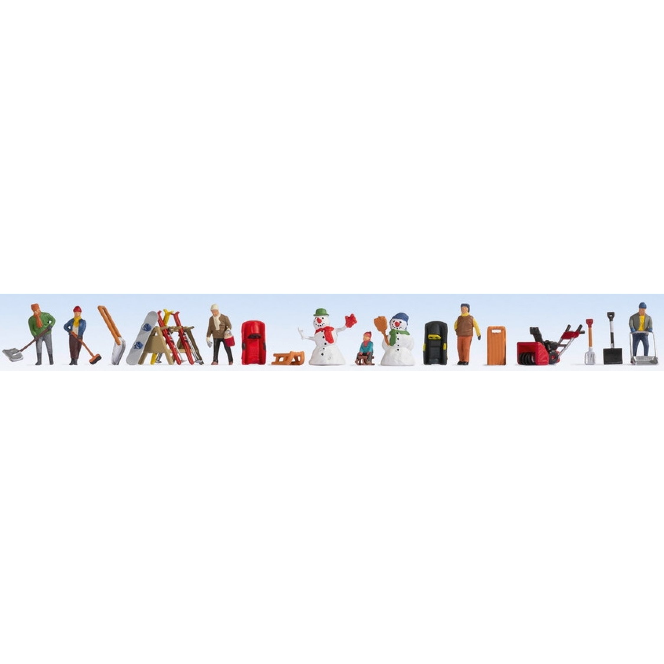 Figuren-Themenwelt - Wintertag, Inhalt: 6 Figuren, 2 Bobs, 2 Holzschlitten, 2 Schneemänner, 1 Schneefräse, 2 Schneeschaufeln, Snowboard, Skiständer