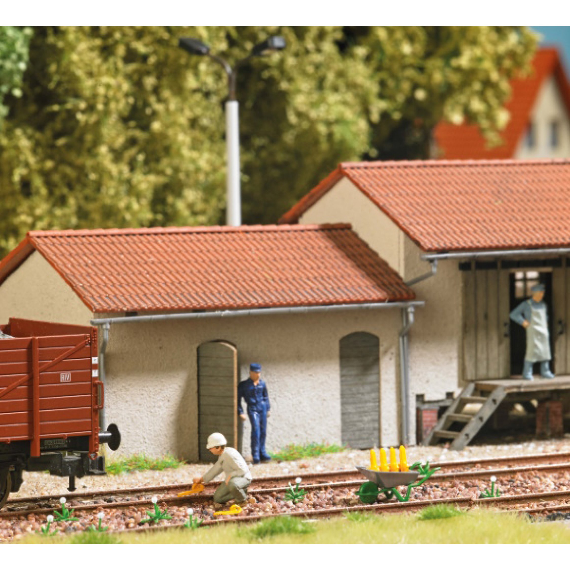 Hemmschuhleger: Bahnarbeiter, Hemmschuhe, Schubkarren