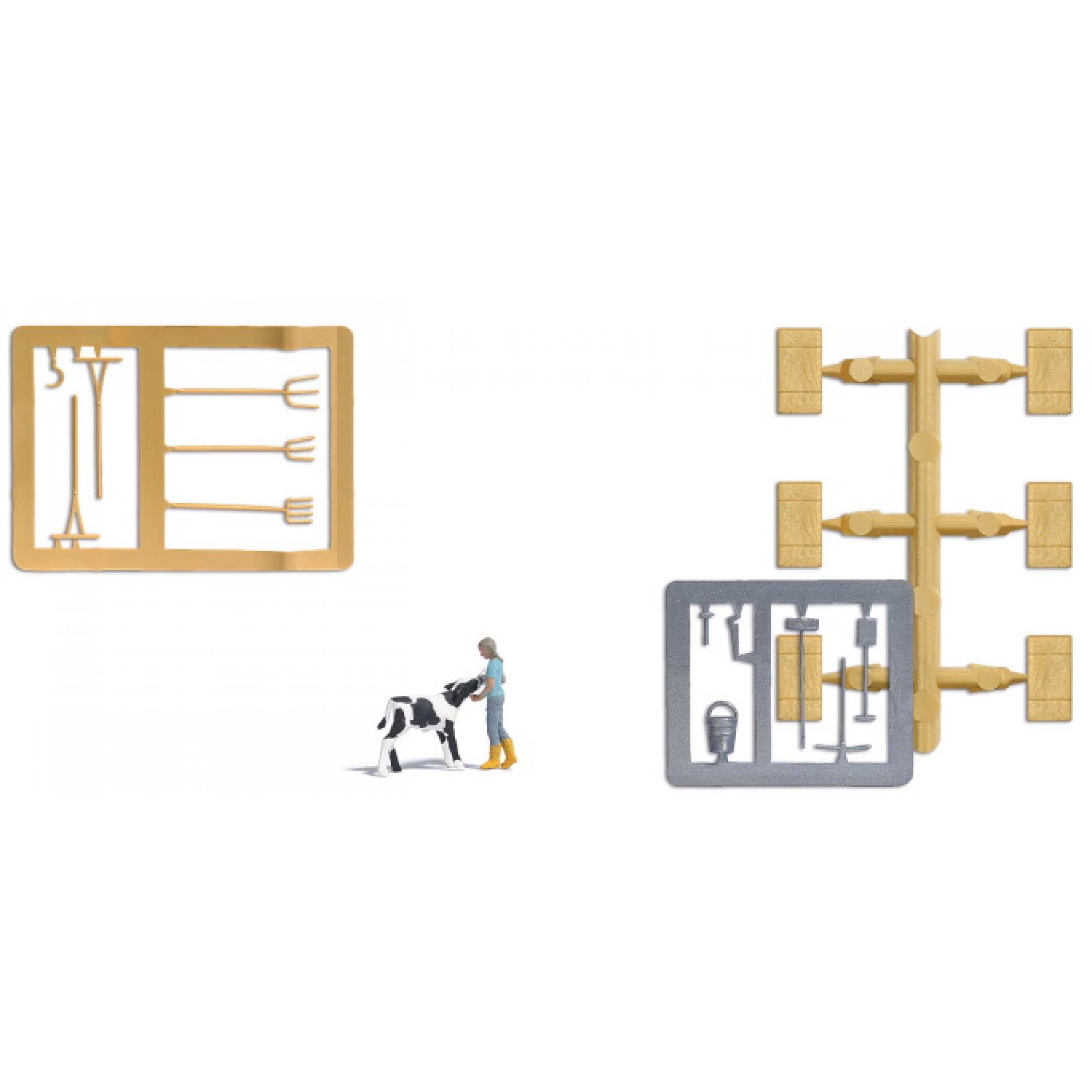 4. Kälberfütterung, Bäuerin, die eine Kuh mit der Milchflasche füttert. Mit Heuballen und Stallwerkzeug