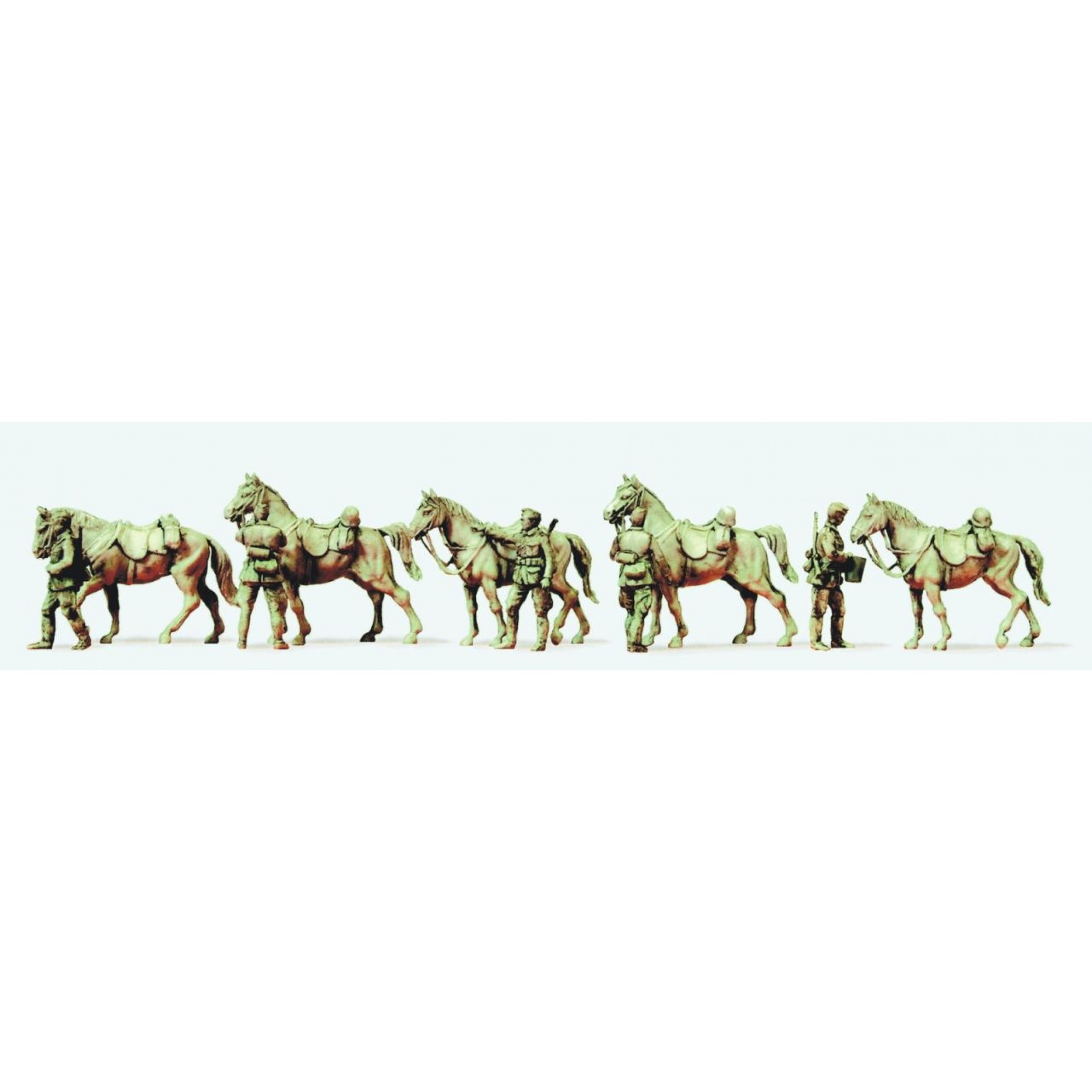 Kavalleristen stehend. Pferde. Deutsches Reich 1939-45, 5 unbemalte Figuren, 5 unbemalte Pferde, Bausatz