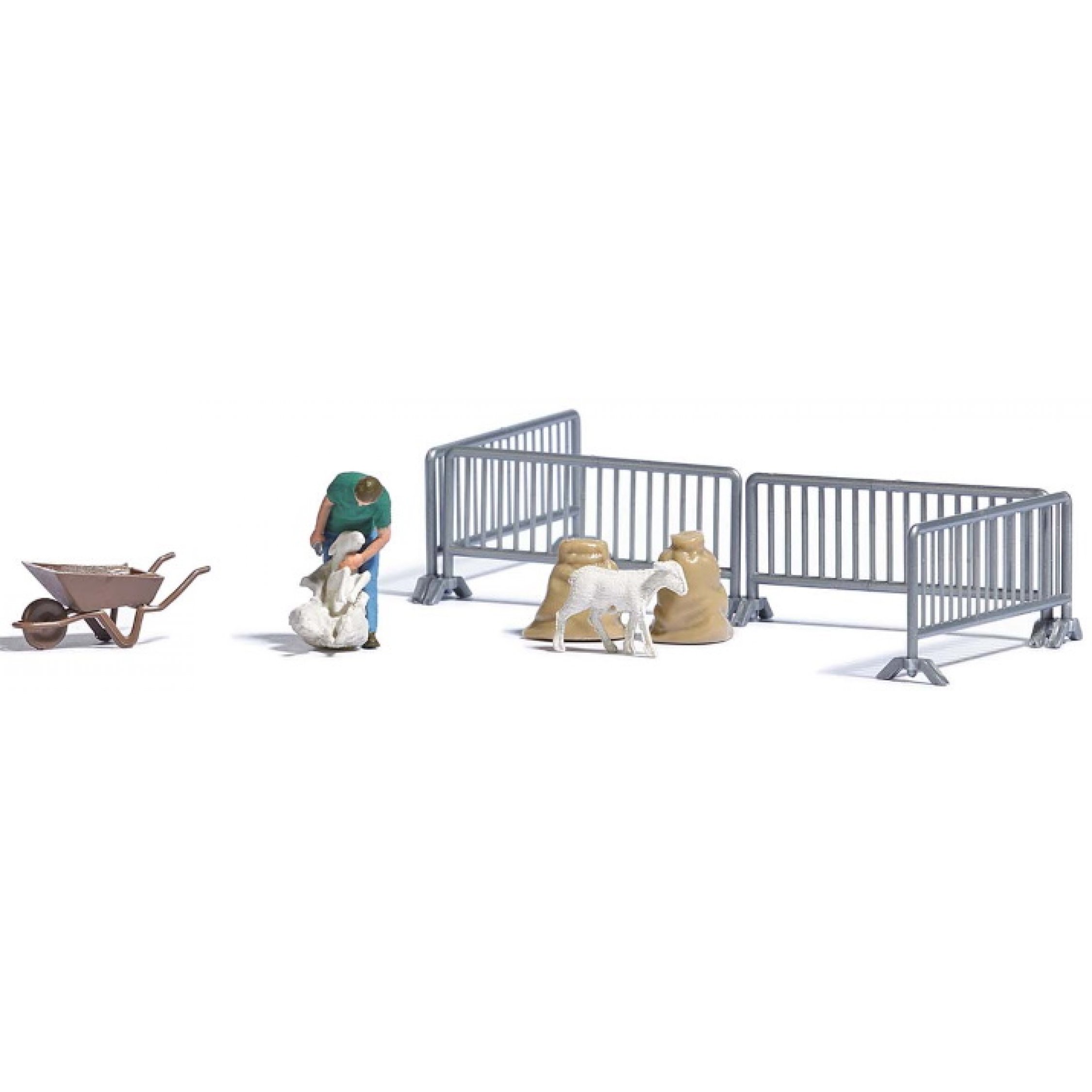 4. Schafschur, Schafscherer, der ein Schaf schert und ein geschorenes Schaf, mit Schafpferch sowie Schubkarren nd Säcken für die Schafwolle