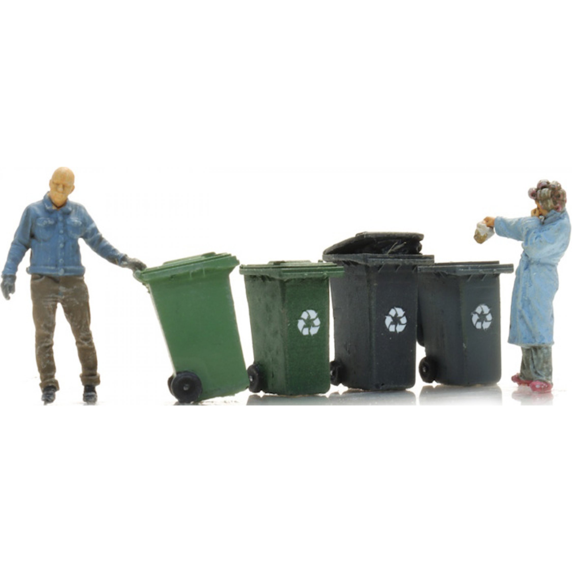 Vier Mülltonnen mit 2 Figuren