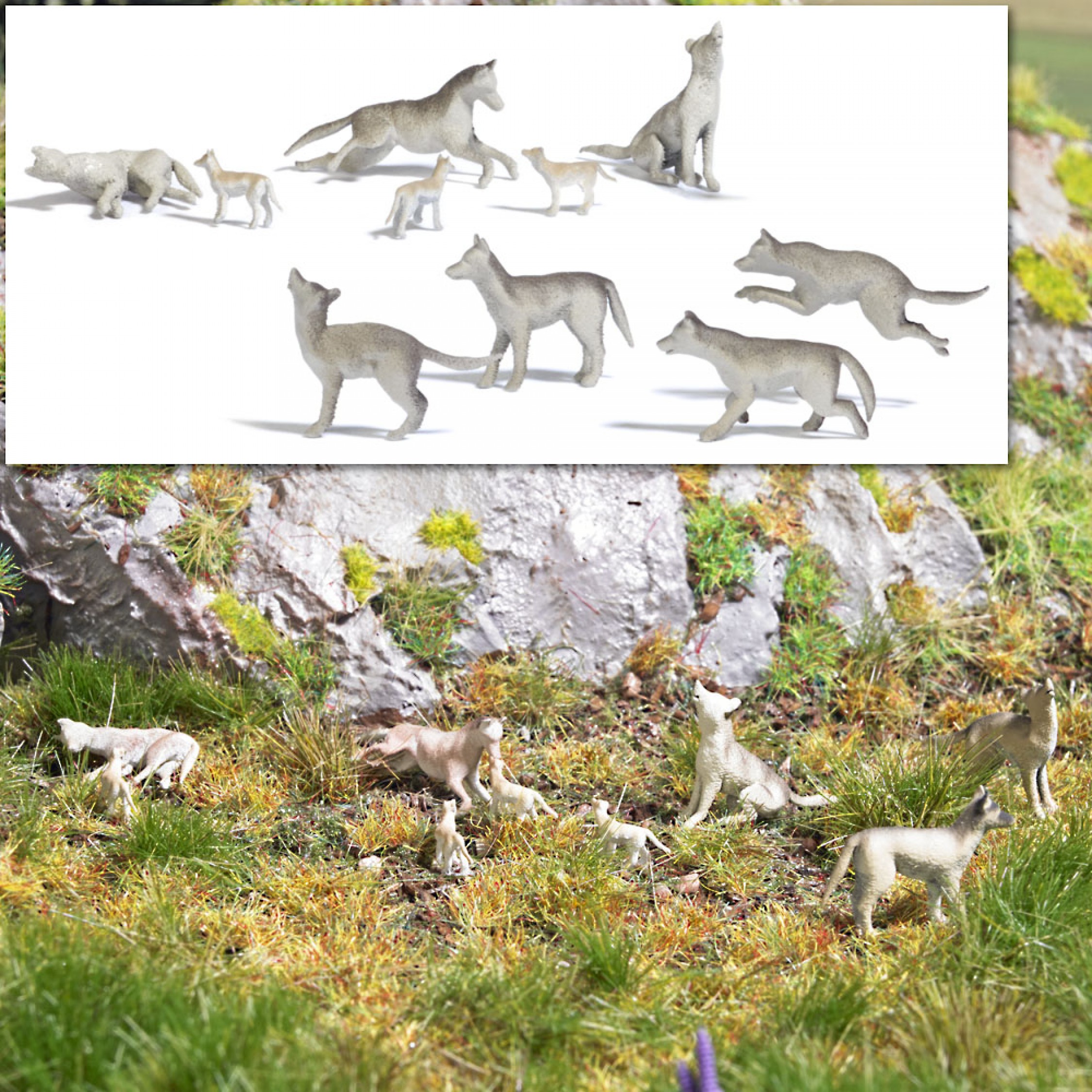 4. Wolfsrudel bestehend aus 10 Wölfen (stehend, laufend, sitzend, liegend), davon 3 Jungwölfe, Fertigmodell