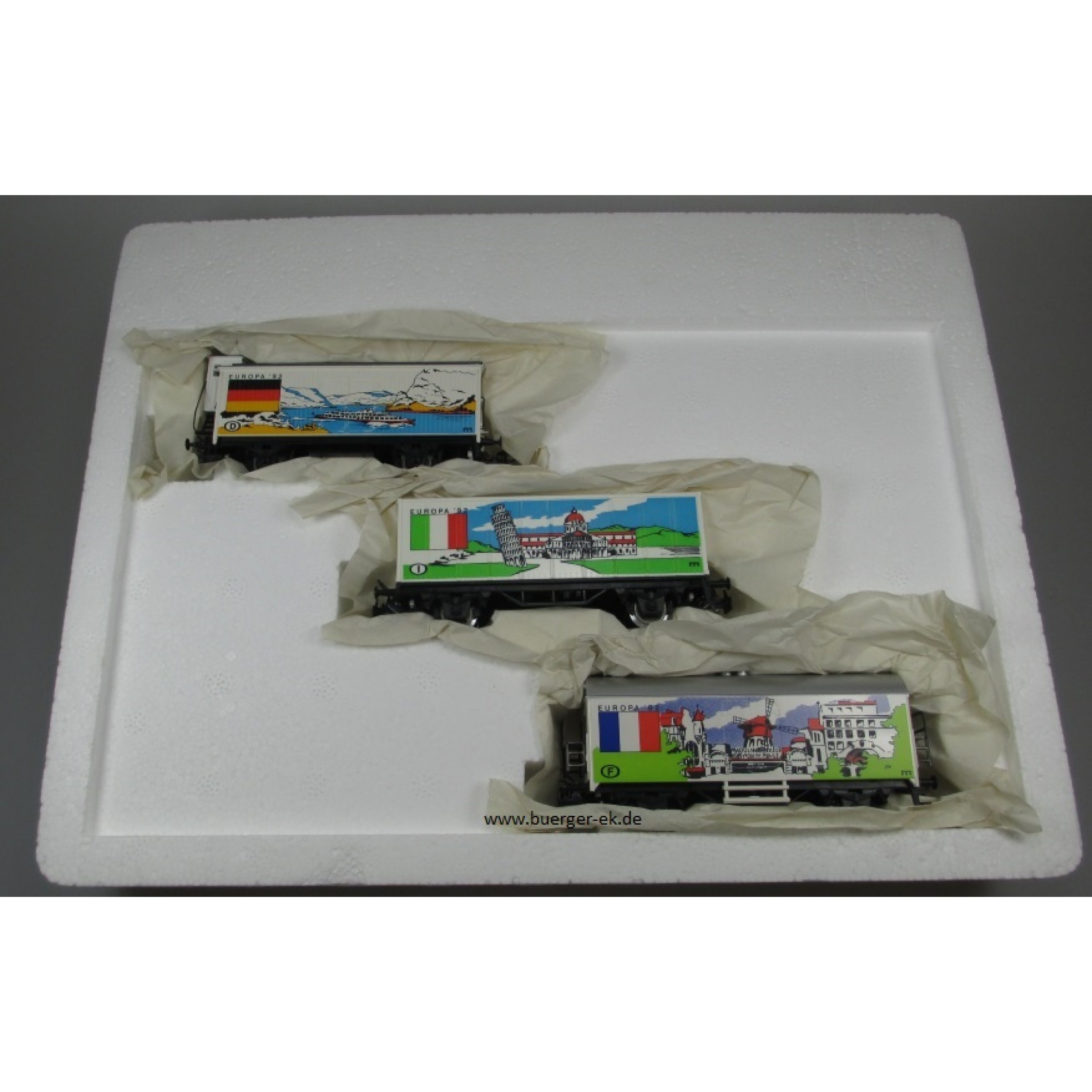 EUROPA 1992 Inhalt 3 Wagen: 1) Gedeckter Güterwagen mit Bremserhaus Deutschland Loreley Rheinschiff, 2) Containerwagen (4481) Italien, 1 Gedeckter Güterwagen (4415) Frankreich