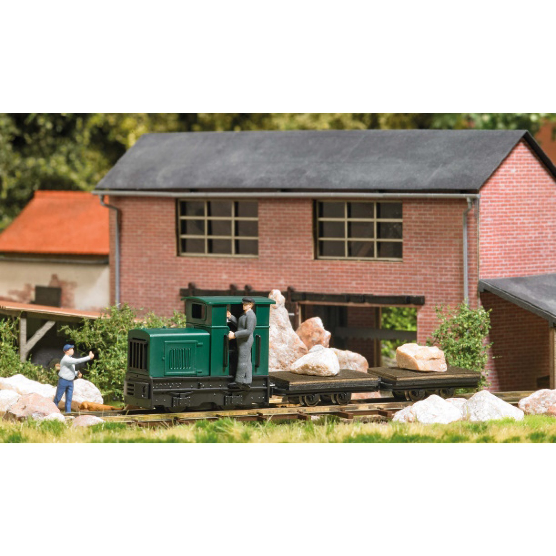 4. Feldbahn Start-Set Steinbruch, Feldbahnlokomotive Gmeinder 15/18 mit 2 Transportwagen beladen mit Felsbrocken, inkl. Gleisen, Batteriekasten, Schalter