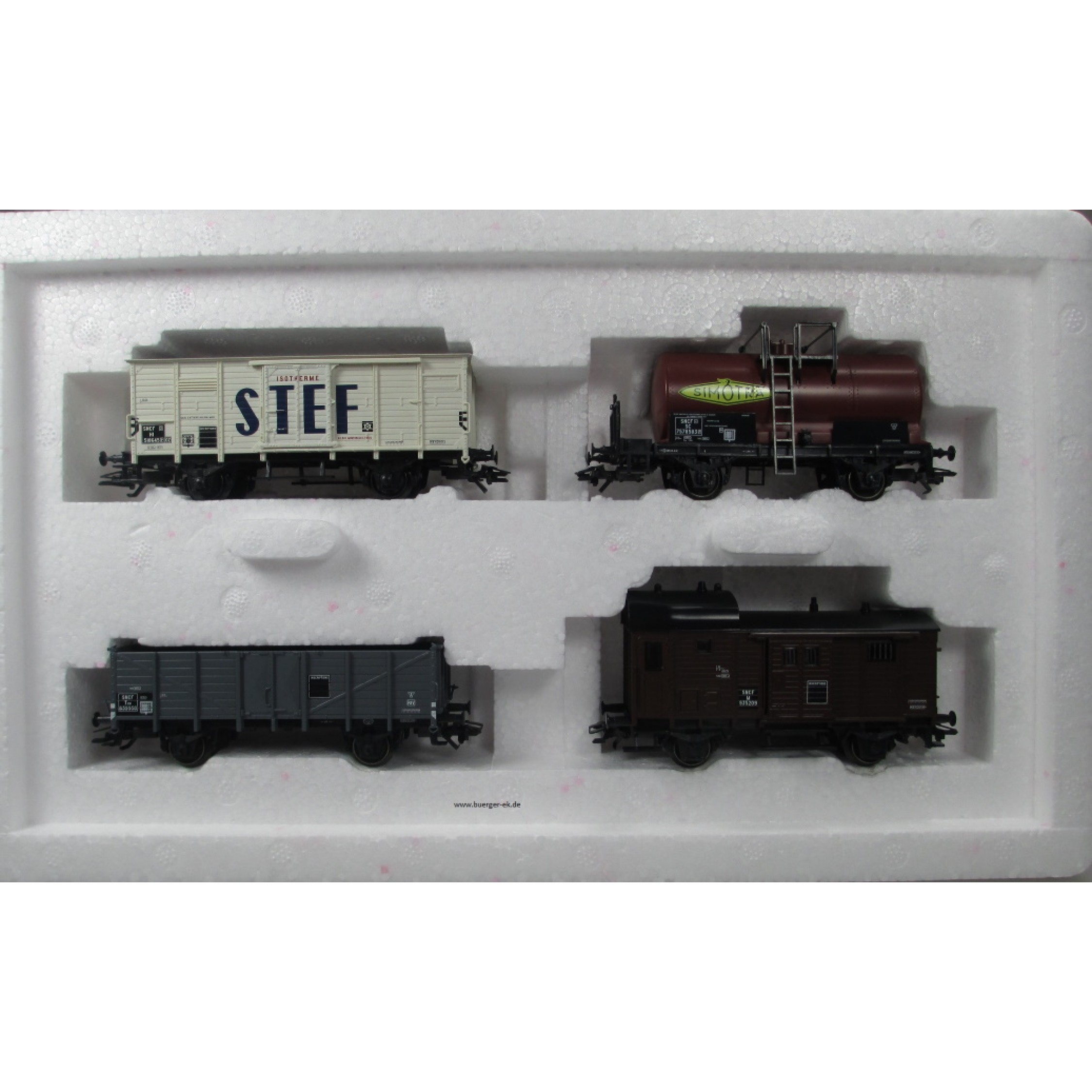 Güterwagen-Set SNCF um 1955, Packung mit 4 verschiedenen Güterwagen: 1) Güterzug-Begleitwagen braun, 2) Gedeckter Güterwagen STEF, 3) Kesselwagen SIMOTRA, 4) Hochbordwagen SNCF TOW 639950 grau,