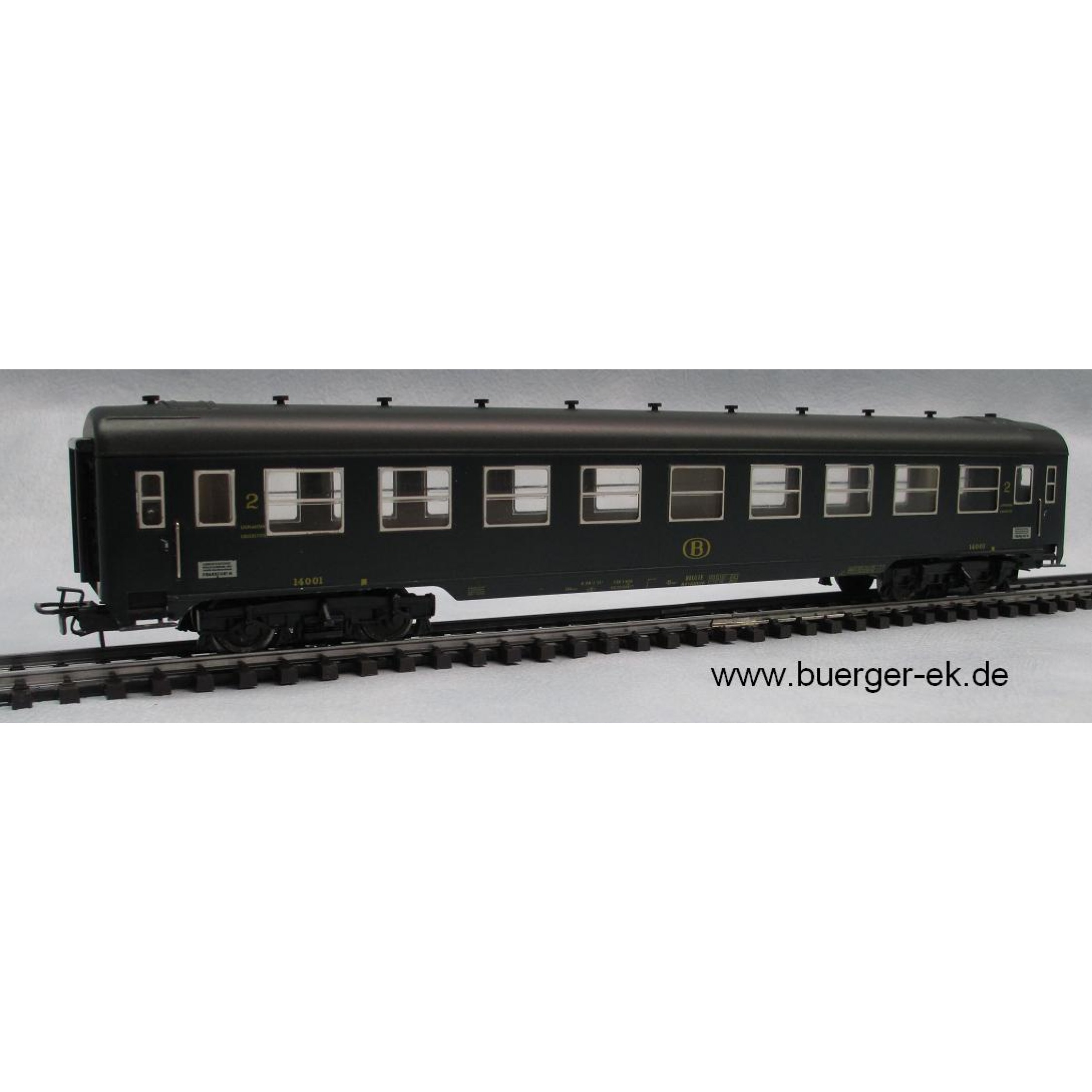Liegewagen der SNCB, 2.Klasse, 4achsig, dunkelgrün, mit Wagen-Nr. 14001, Drehgestelle Minden-Deutz