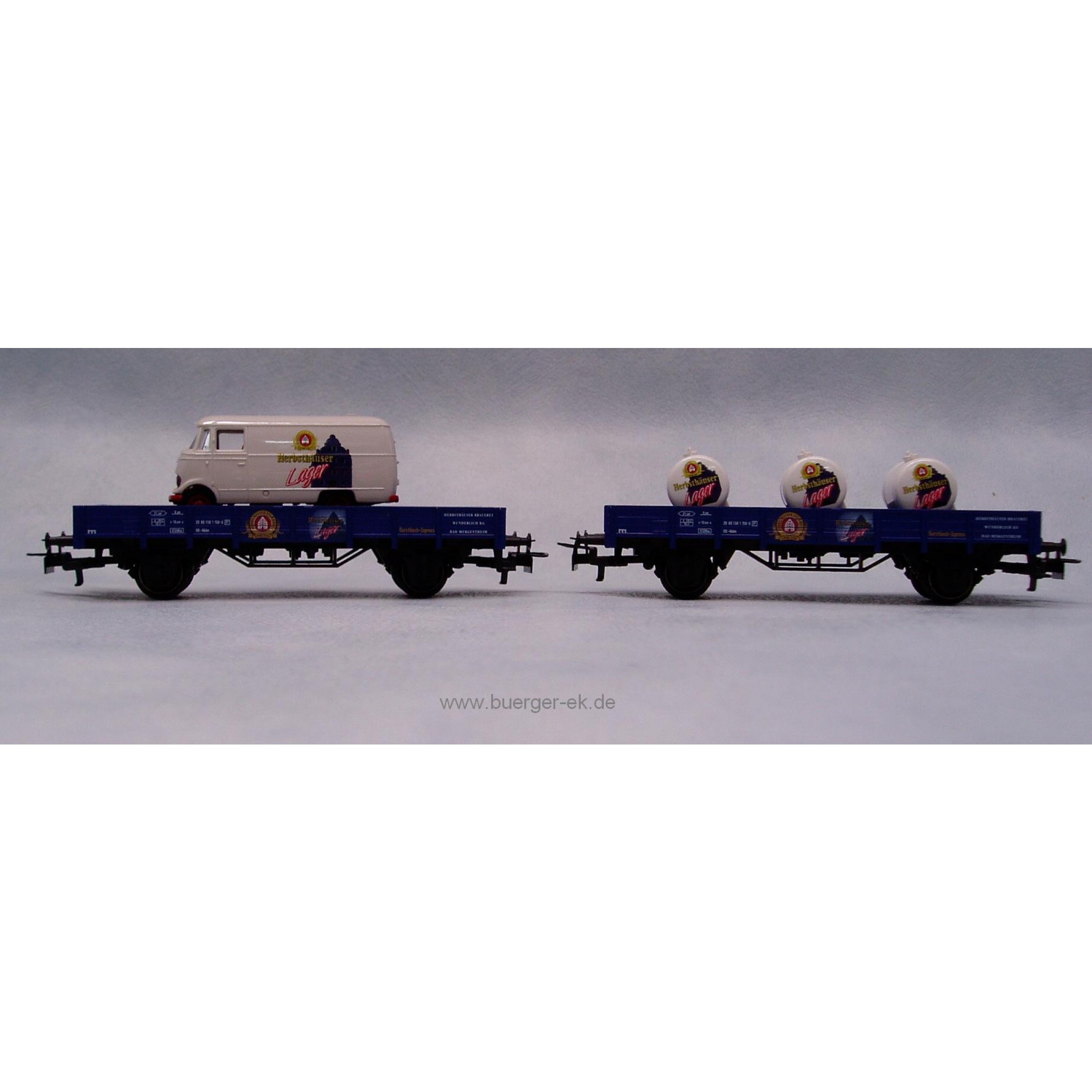 Set "Herbsthäuser Lager Bier", Inhalt: 2 Niederbordwagen Herbsthäuser Lager (blau), mit Brekina Mercedes-Benz Kastenwagen "Herbsthäuser Lager" und 3 zylindrischenn Bierbehältern "Herbsthäuser Lager"