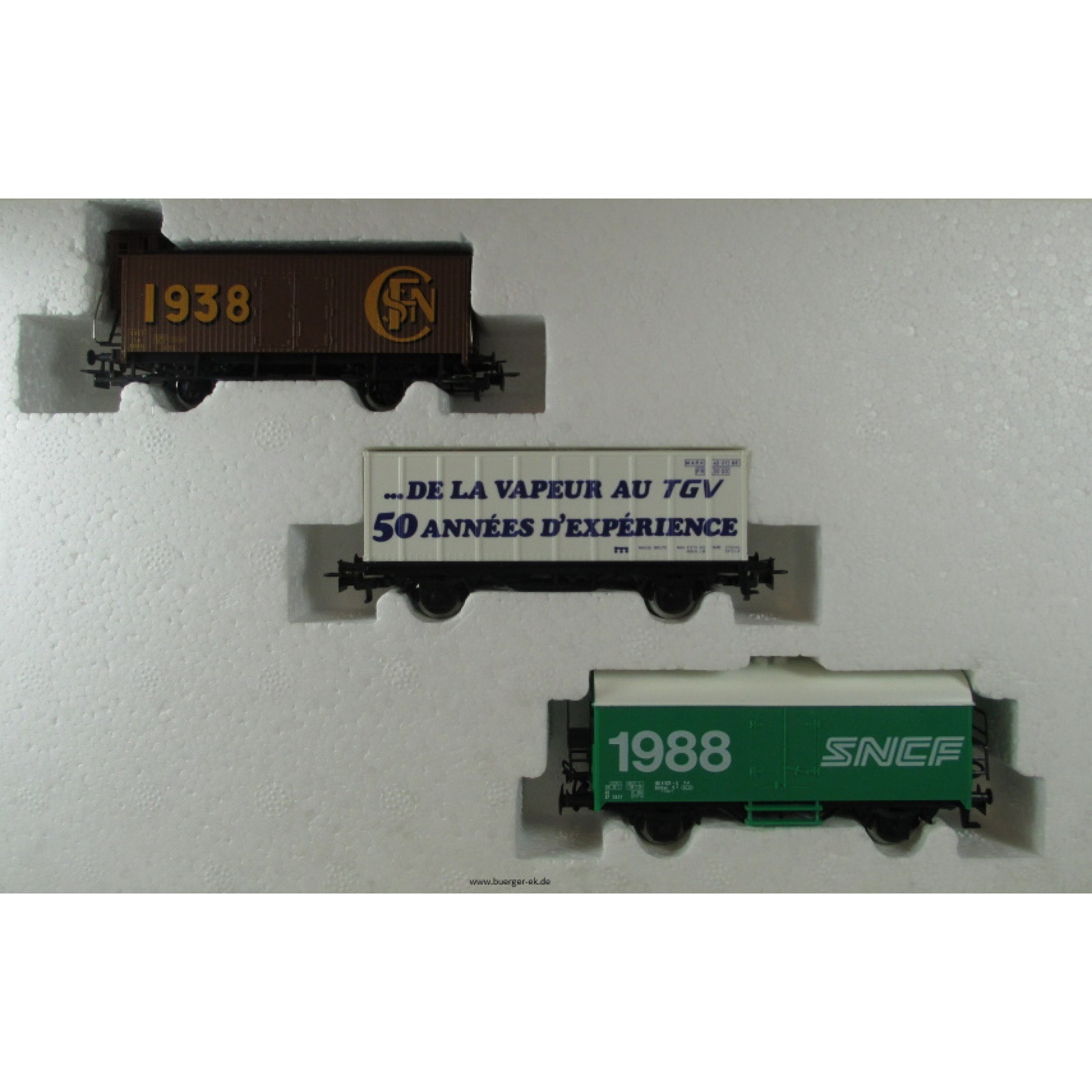 SNCF Wagen-Set, Inhalt 3 Güterwagen: 1) Gedeckter Güterwagen mit Bremserhaus (4680) SNCF 1938, braun, 2) Gedeckter Güterwagen (4415) SNCF 1988, grün, 3) Containerwagen (4481) DE LA VAPEUR AU TGV 50 ANNEES D'EXPERIENCE,