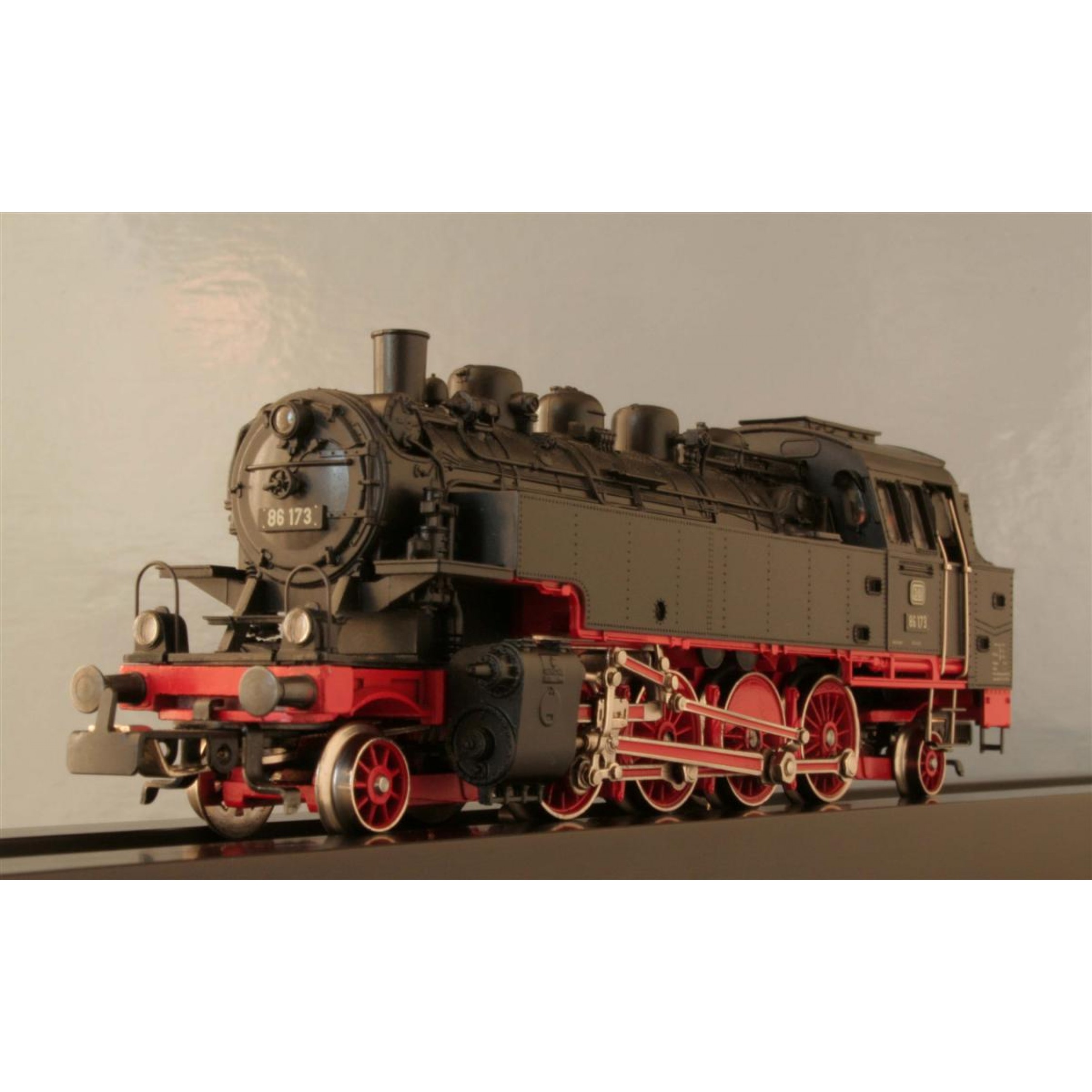 4. Tenderdampflokomotive BR 86 der DB, schwarz, mit Lampenbügel, einfacher Kreuzkopf, Gestängeteil aus Draht, alle Achsen mit kleiner Schwungmasse,